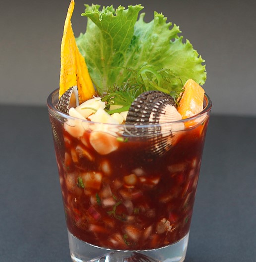 Ceviche tradicional con mariscos y leche de tigre, acompañado de choclo y camote.