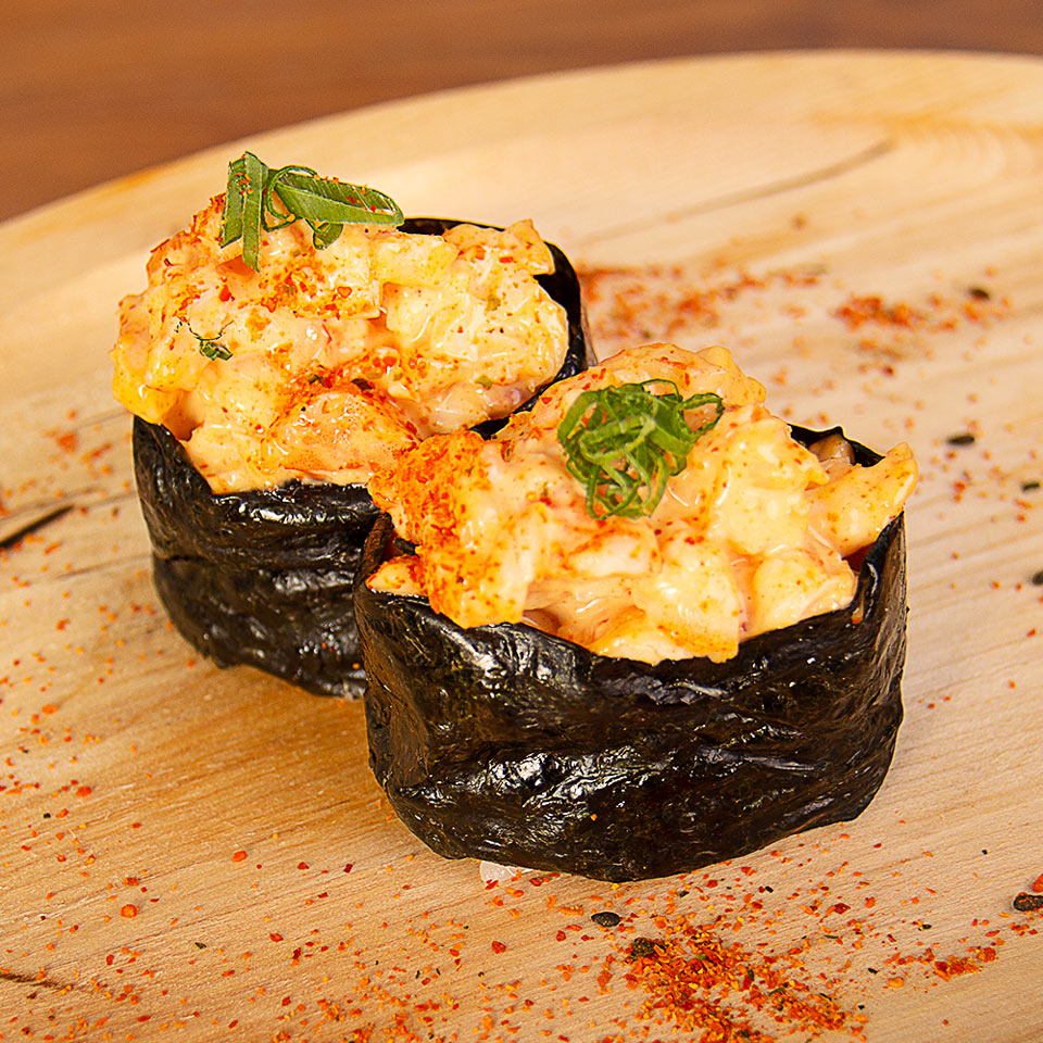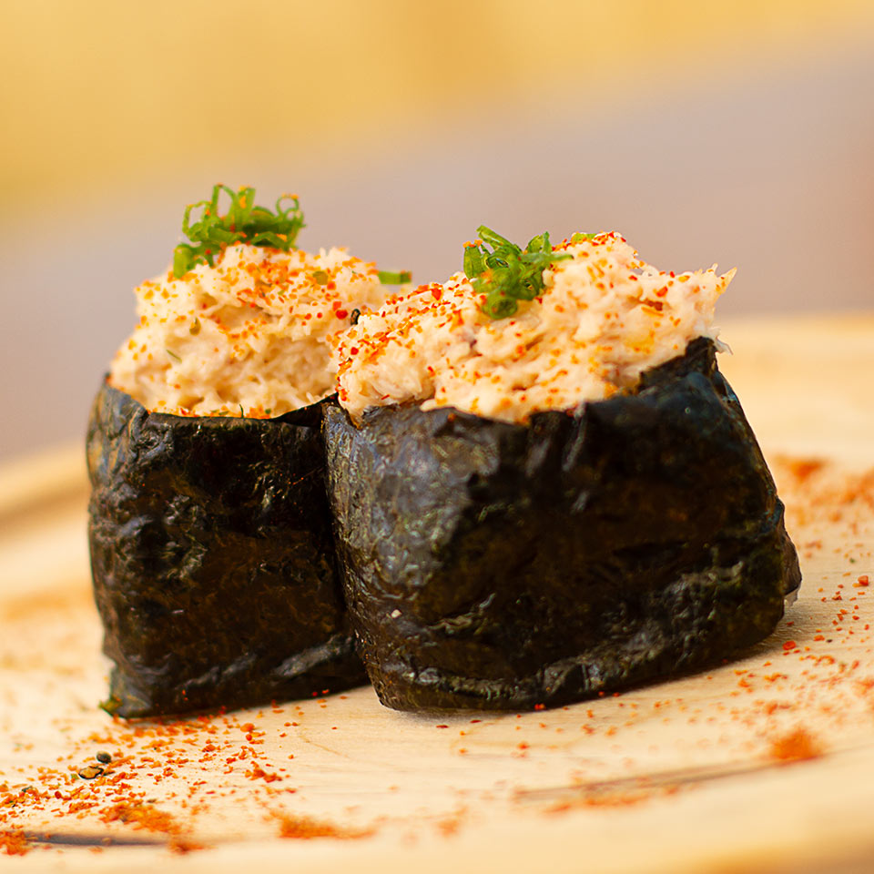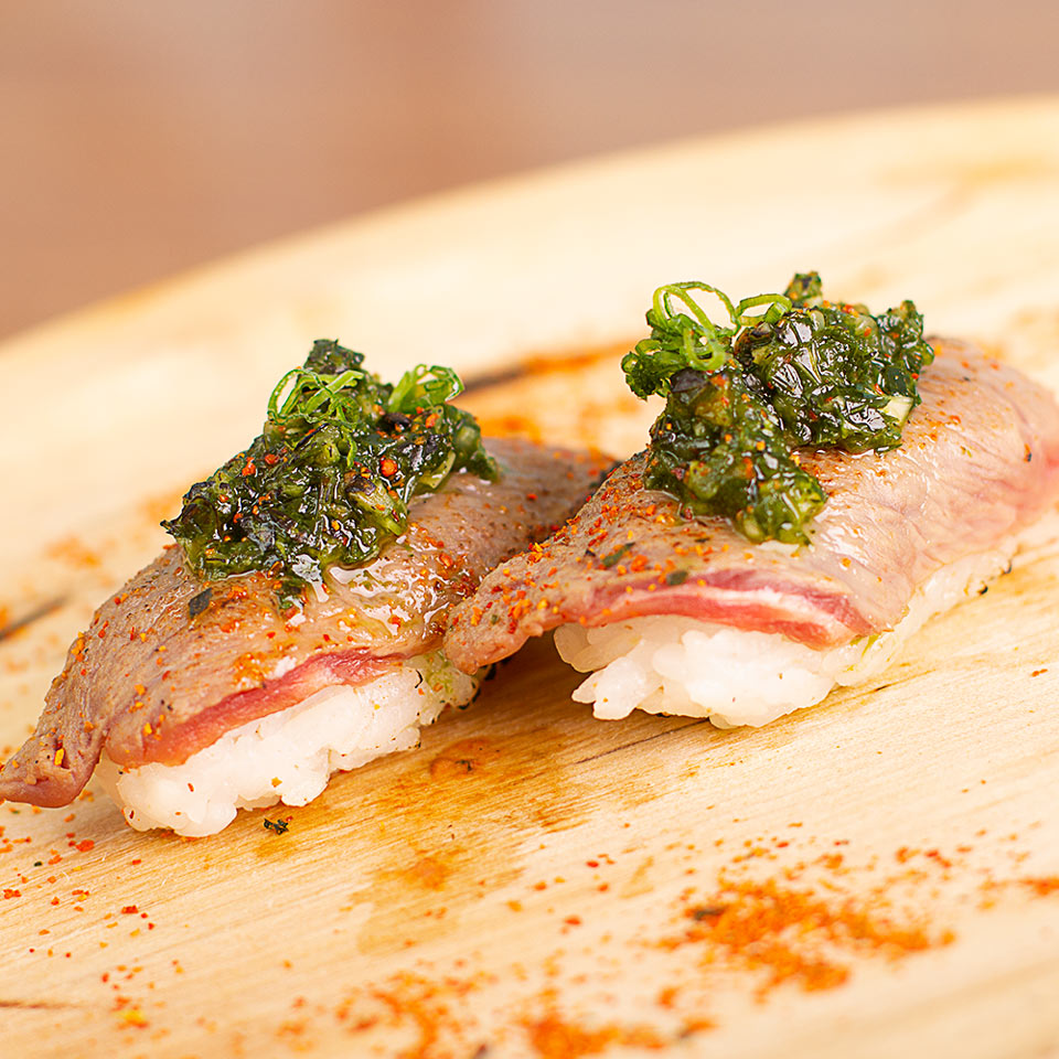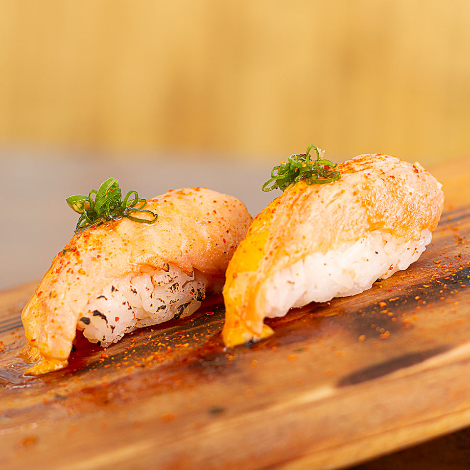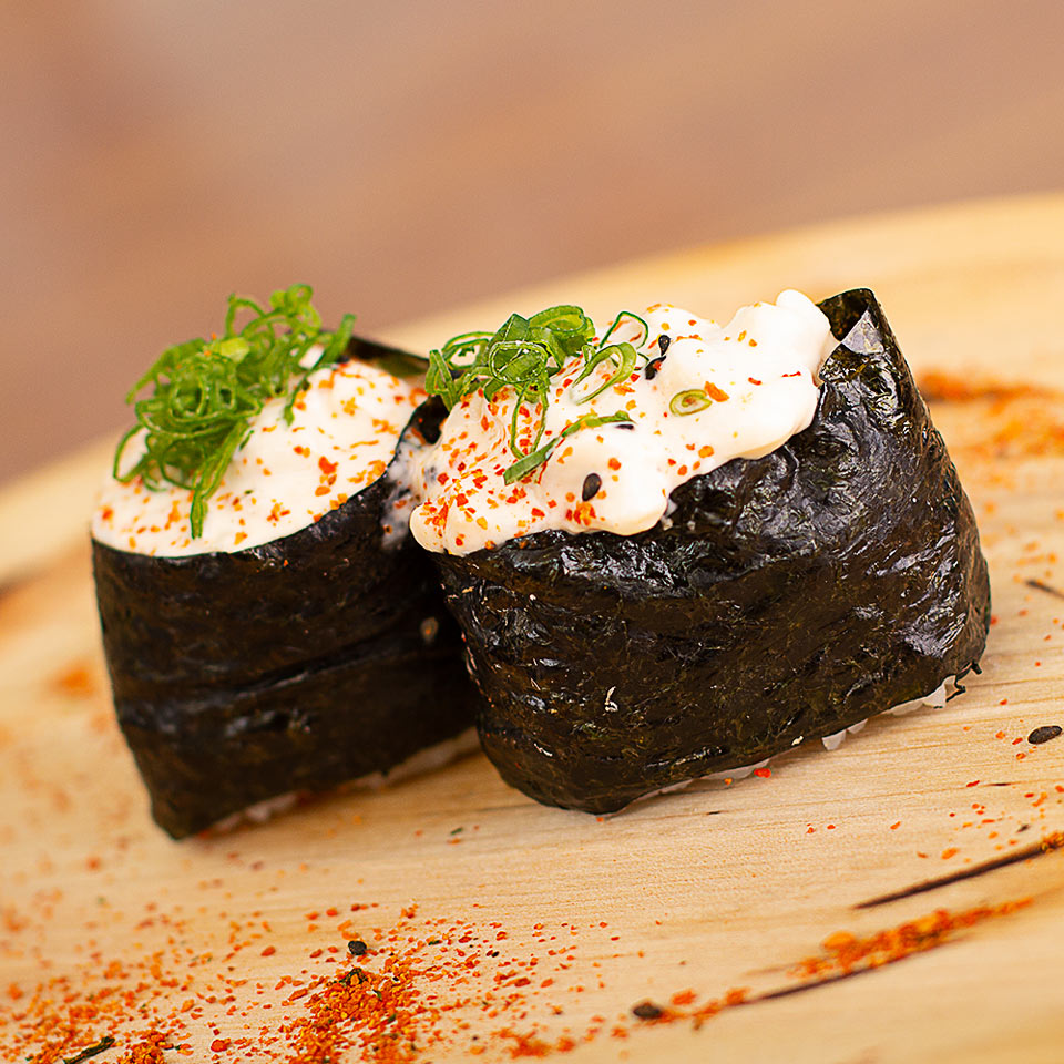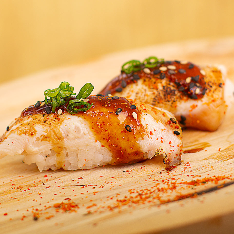 Pescado blanco, salsa abura y cebolla china por 2 unidades.