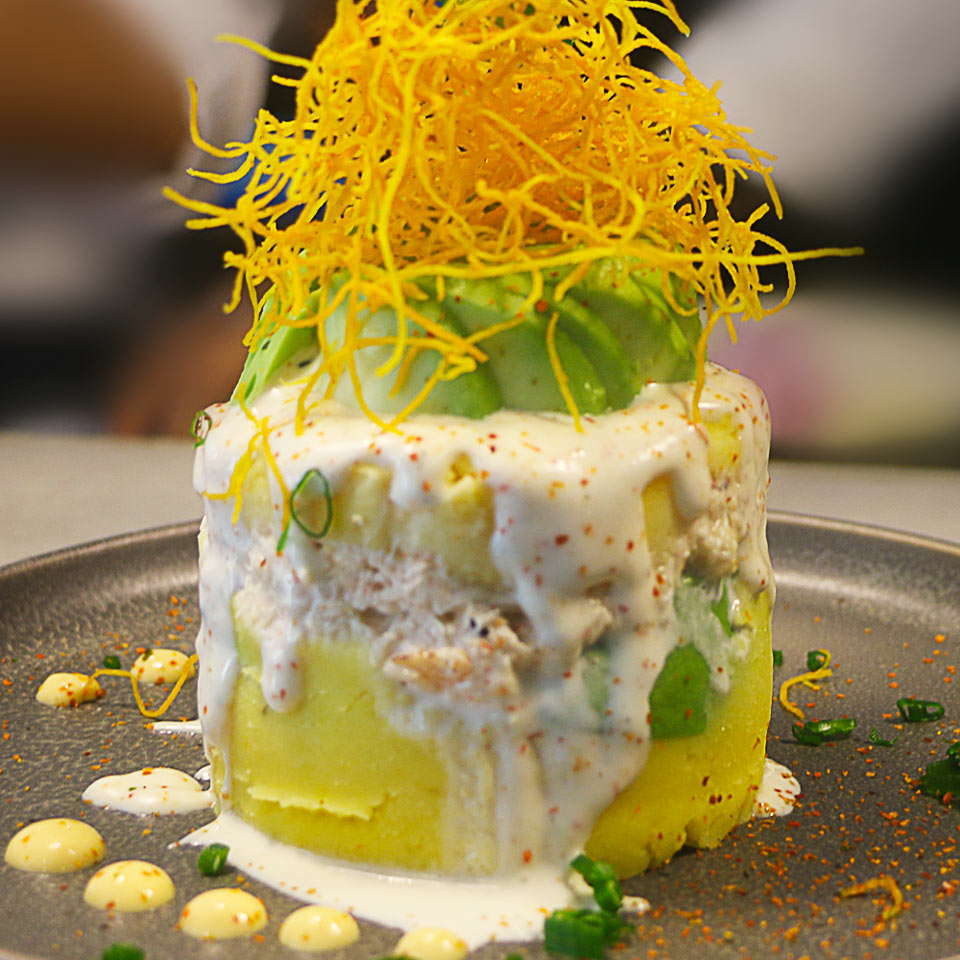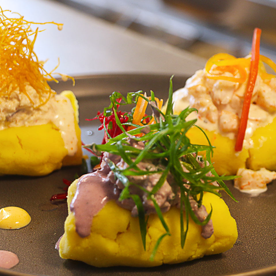 Trio de causas tradicionales montadas con pulpa de cangrejo, pulpo al olivo y langostinos en salsa acevichada.