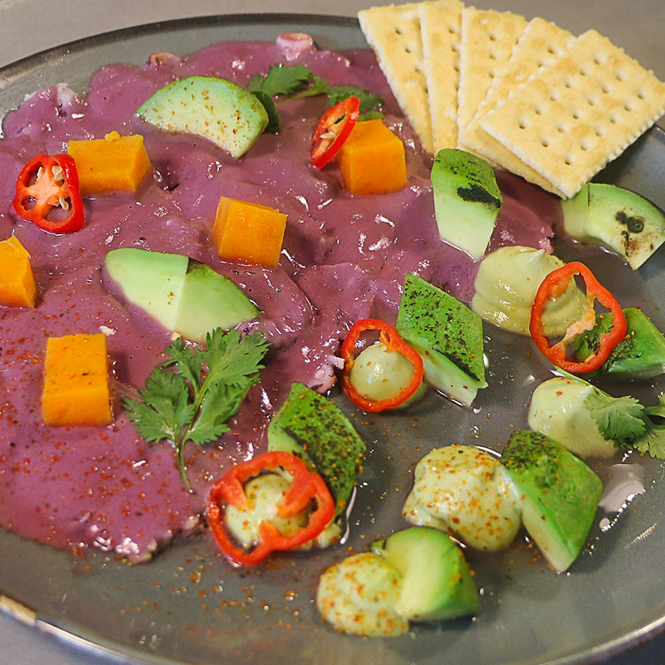 Láminas de pulpo bañadas con salsa al olivo y palta, acompañadas de galletas de soda.