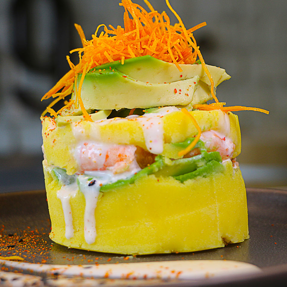 Tradicional causa de papa amarilla rellena de langostinos y palta, bañada con salsa acevichada.