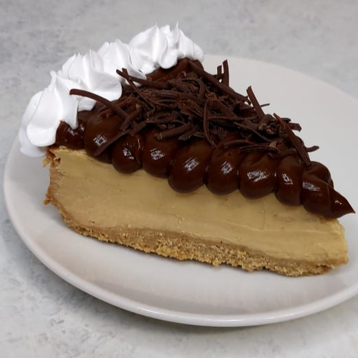 Porción de cheescake horneado con base de galleta, crema de queso, fudge y virutas de chocolate
