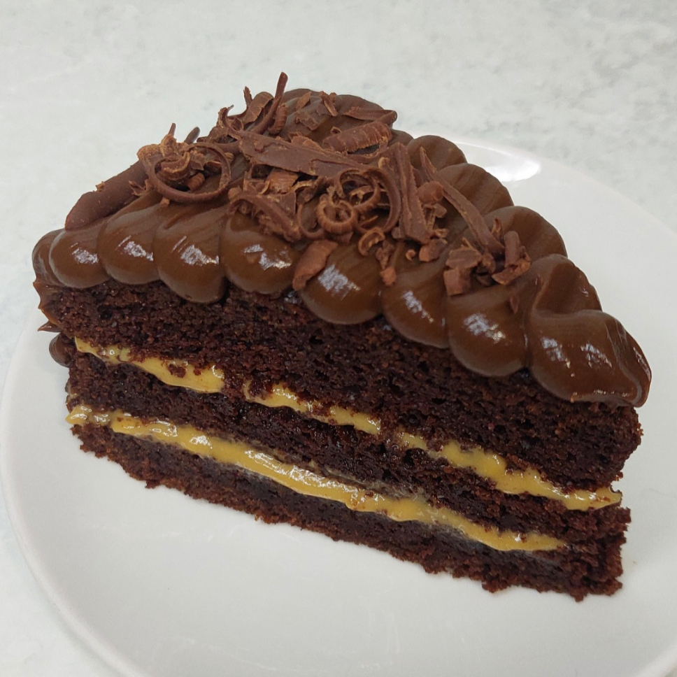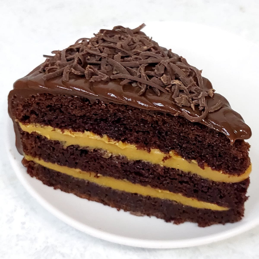 Porción de torta de chocolate húmeda, rellena de manjarblanco, cubierta de fudge de olla y virutas de chocolate.