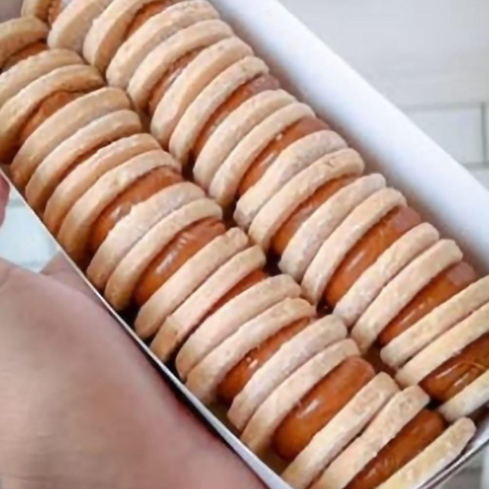 18 alfajores de maicena rellenos de manjar de olla y espolvoreados con azúcar impalpable. Mide cada uno 4 cm