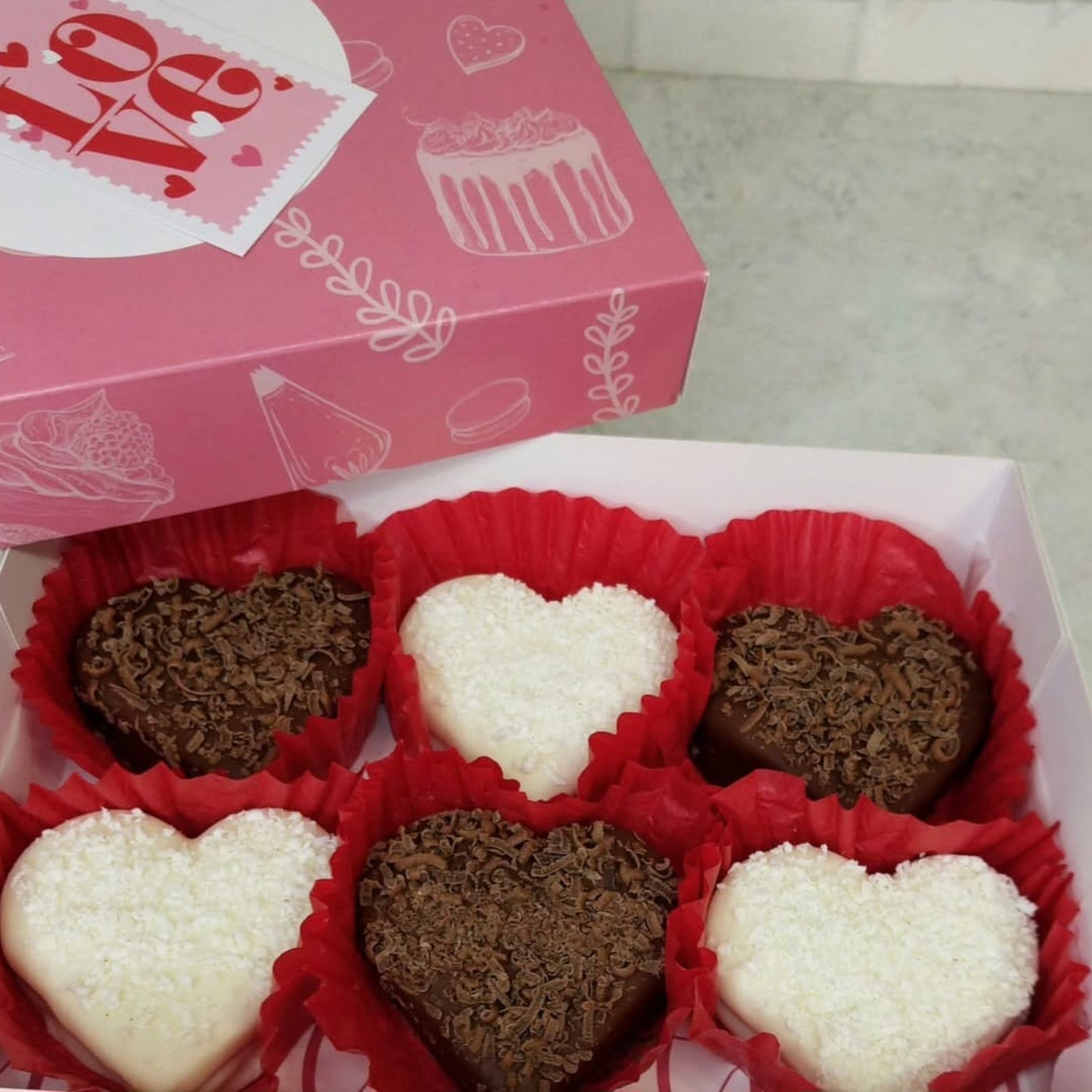Caja de 6 alfajores de maicena en forma de corazón y cubiertos de chocolate blanco y bitter