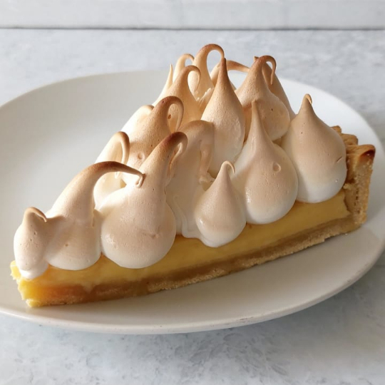 Porción de pie de limón con base de masa sableé, crema de limón y merengue suizo