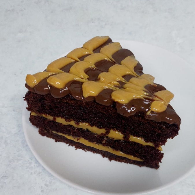 Porción de torta de chocolate húmeda con doble relleno de manjar de olla, cubierta de fudge de olla y virutas de chocolate.