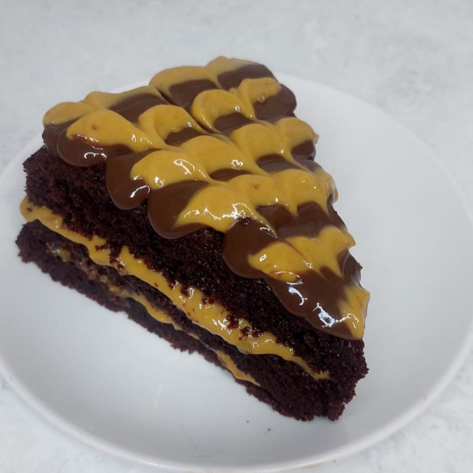 keke húmedo de chocolate con doble relleno de manjar de lúcuma casero, cubierto de fudge y chocolate