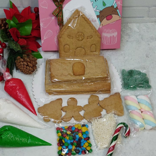 Incluye: base redonda, 6 piezas de galletas, 4 galletitas para decorar, 3 mangas con glase, lentejitas, gomitas, mashmellows, sprinkles, baston de caramelo y cartilla de instrucciones