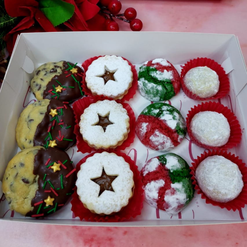 Box surtido de galletas: 3 chocochips, 3 craqueladas, 3 alfajores estrella y 3 besitos de nuez incluye lazo, tarjeta y bastón de caramelo.