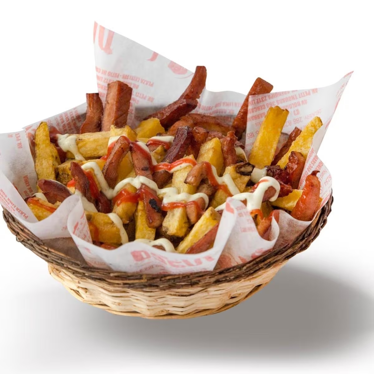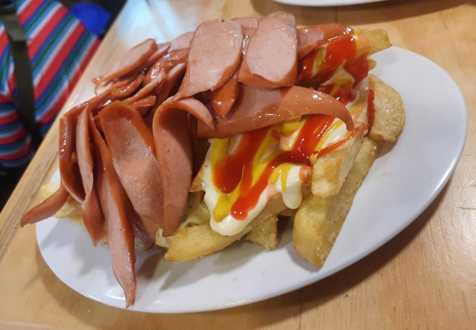 Chorizo, 2 quesos, huevo frito, papas fritas y ensalada.