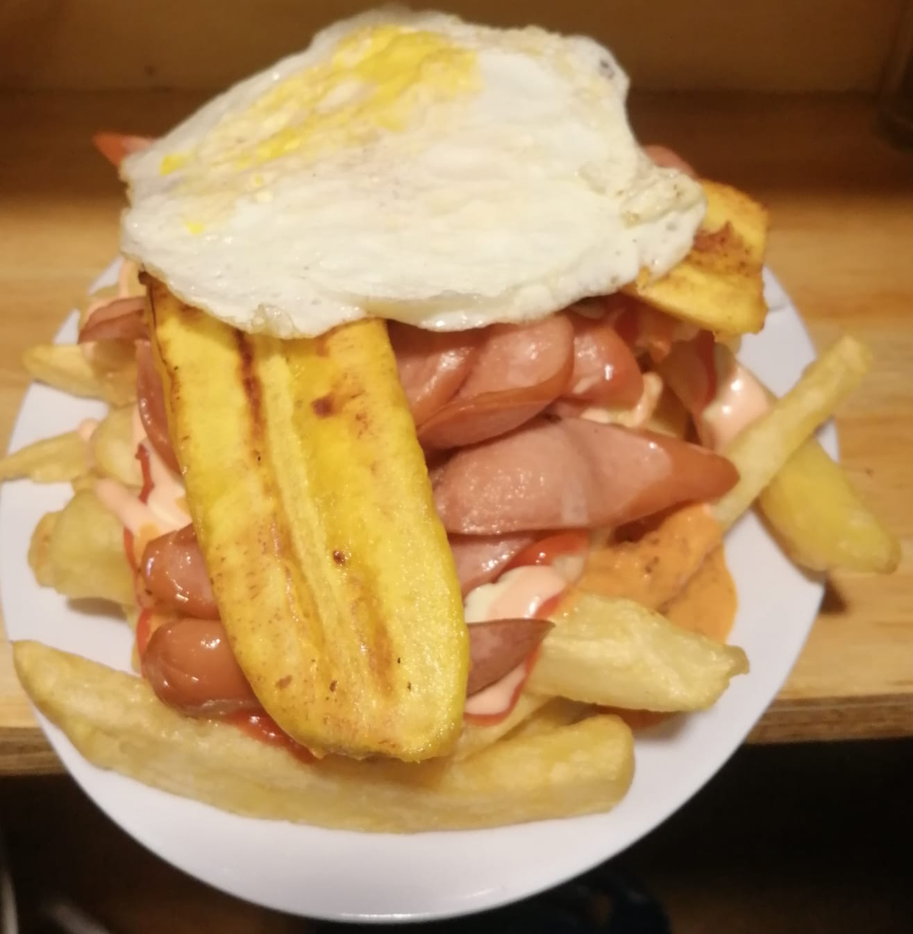 Hot dog, plátano frito, huevo frito, papas fritas y ensalada.