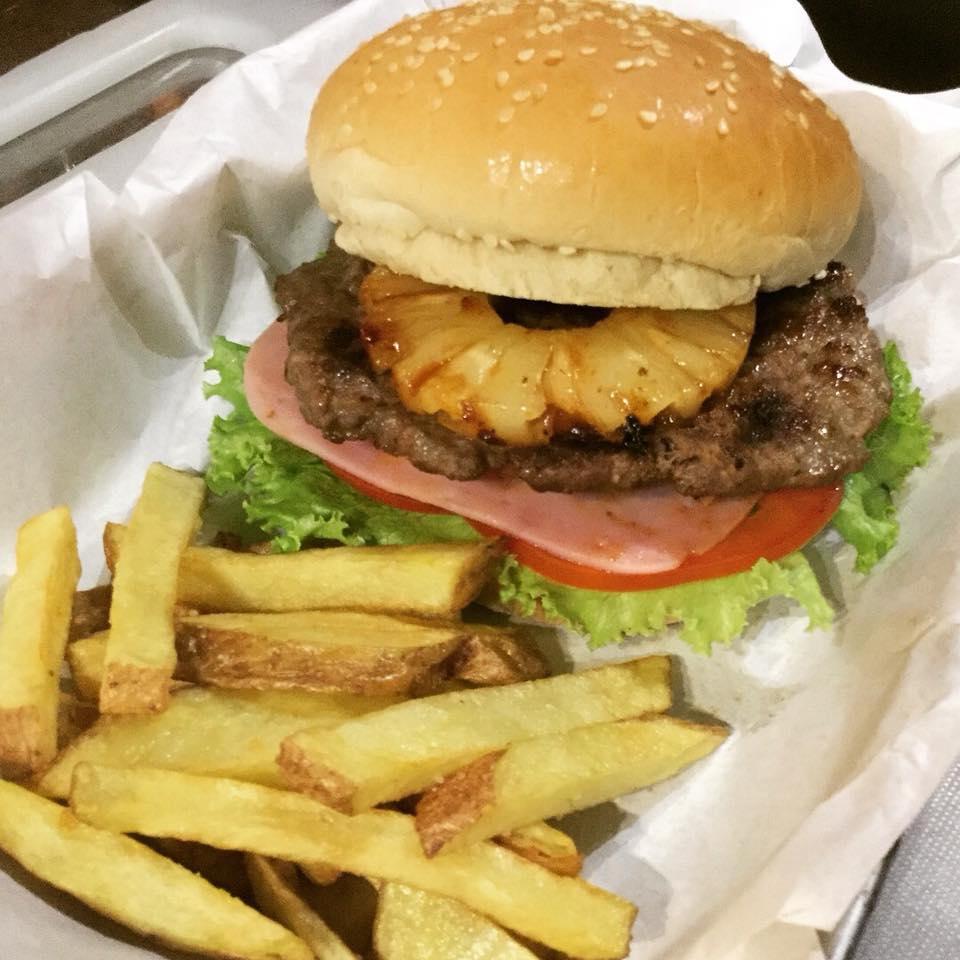 Hamburguesa de carne, 1 rodaja de piña, 2 quesos, jamón, papas fritas y ensalada.