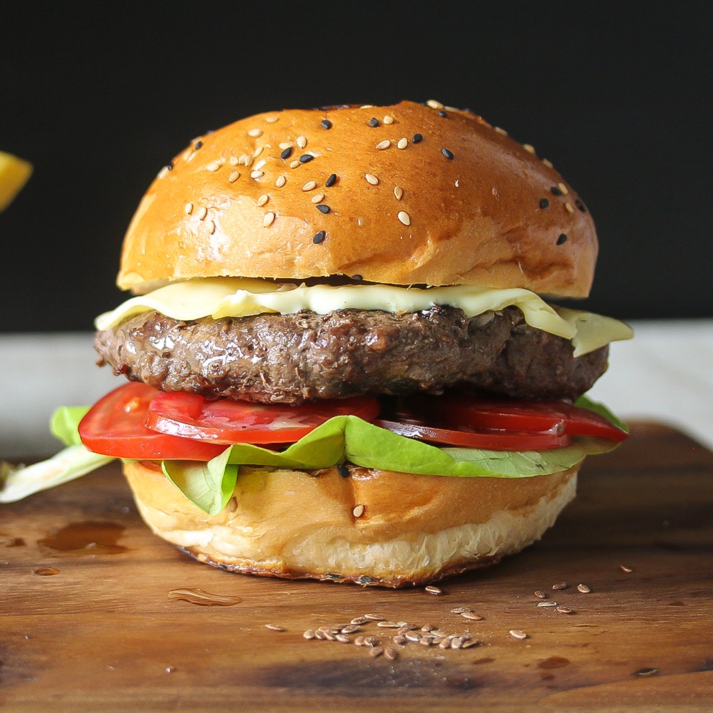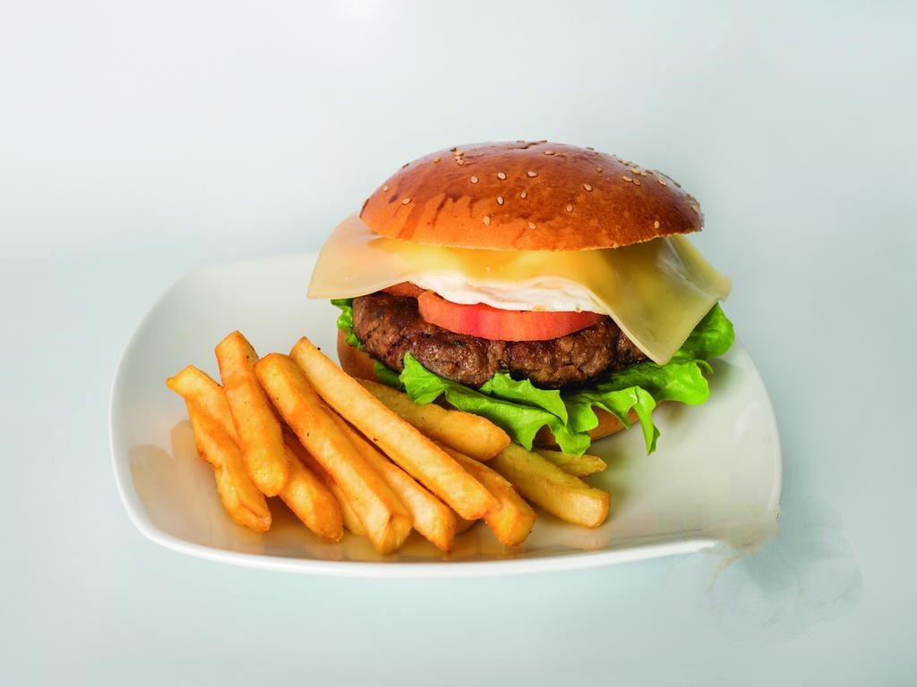 Hamburguesa de carne, ensalada, papas fritas, queso o huevo.
