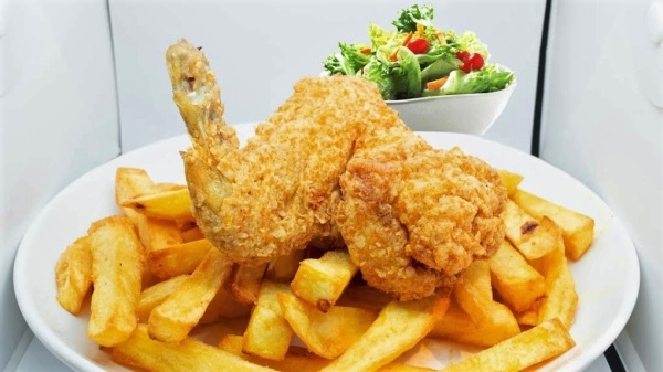 Filete de pollo, hot dog, papas fritas y ensalada.