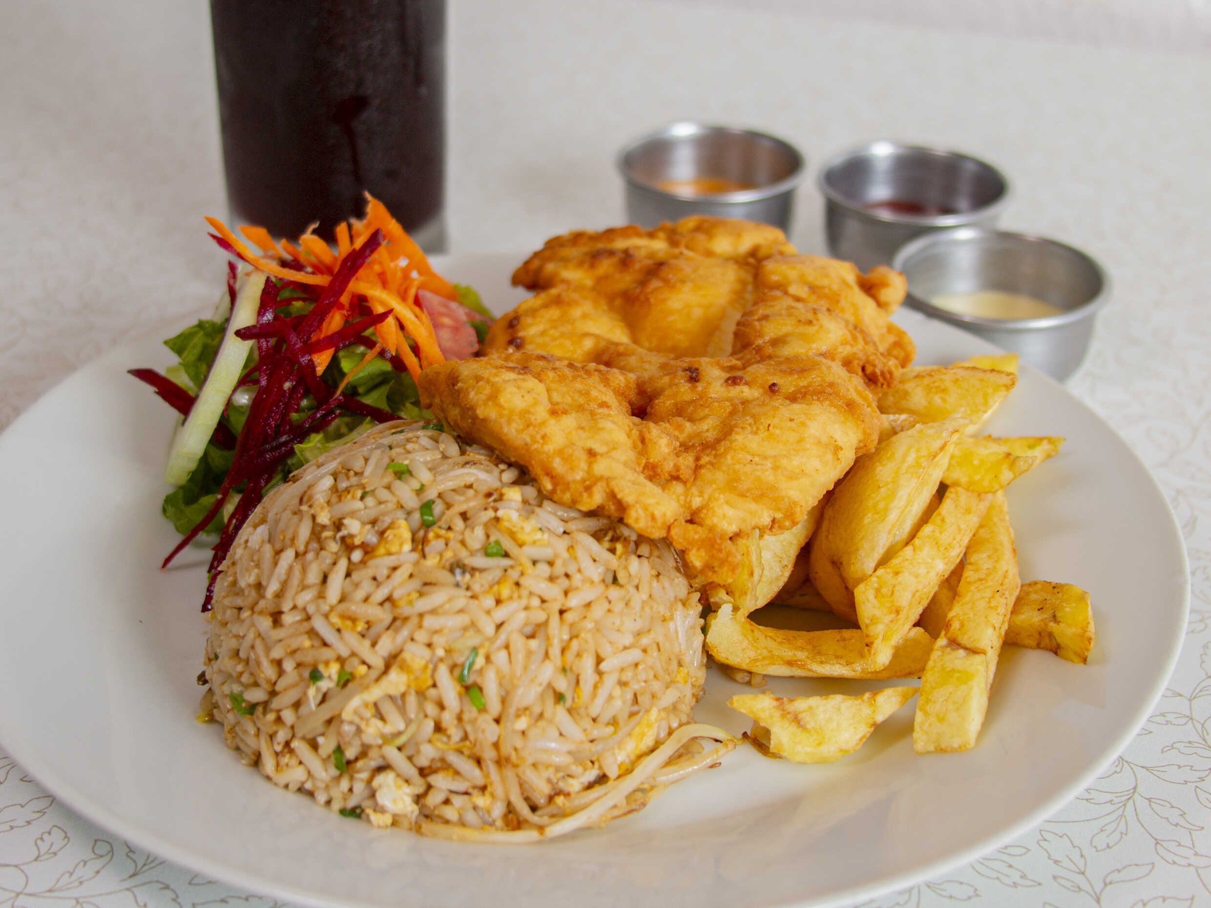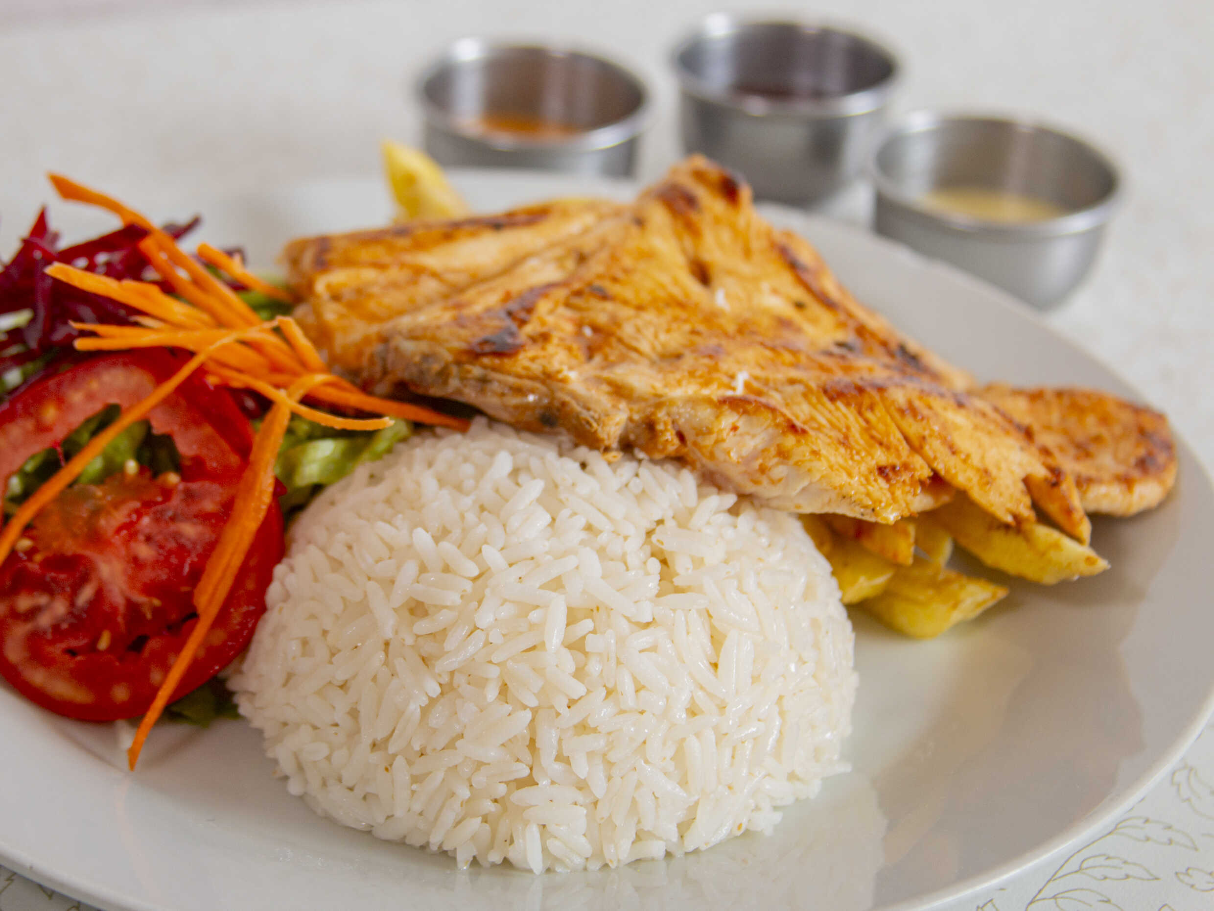 Pechuga de pollo a la plancha, arroz y papas fritas.
