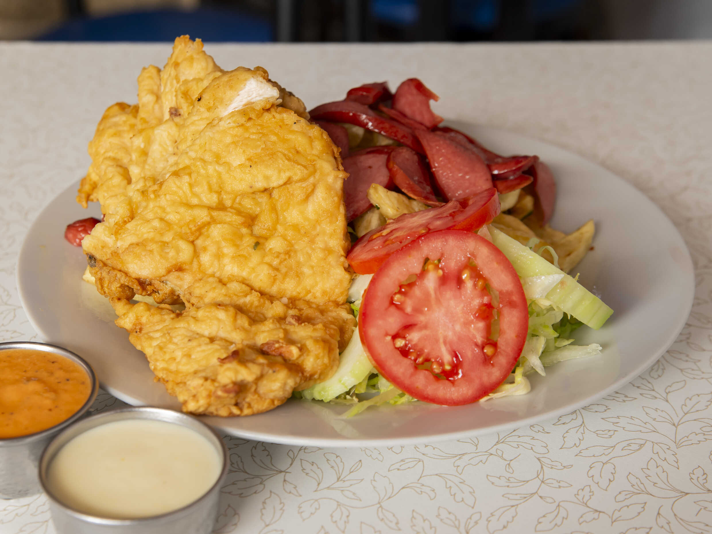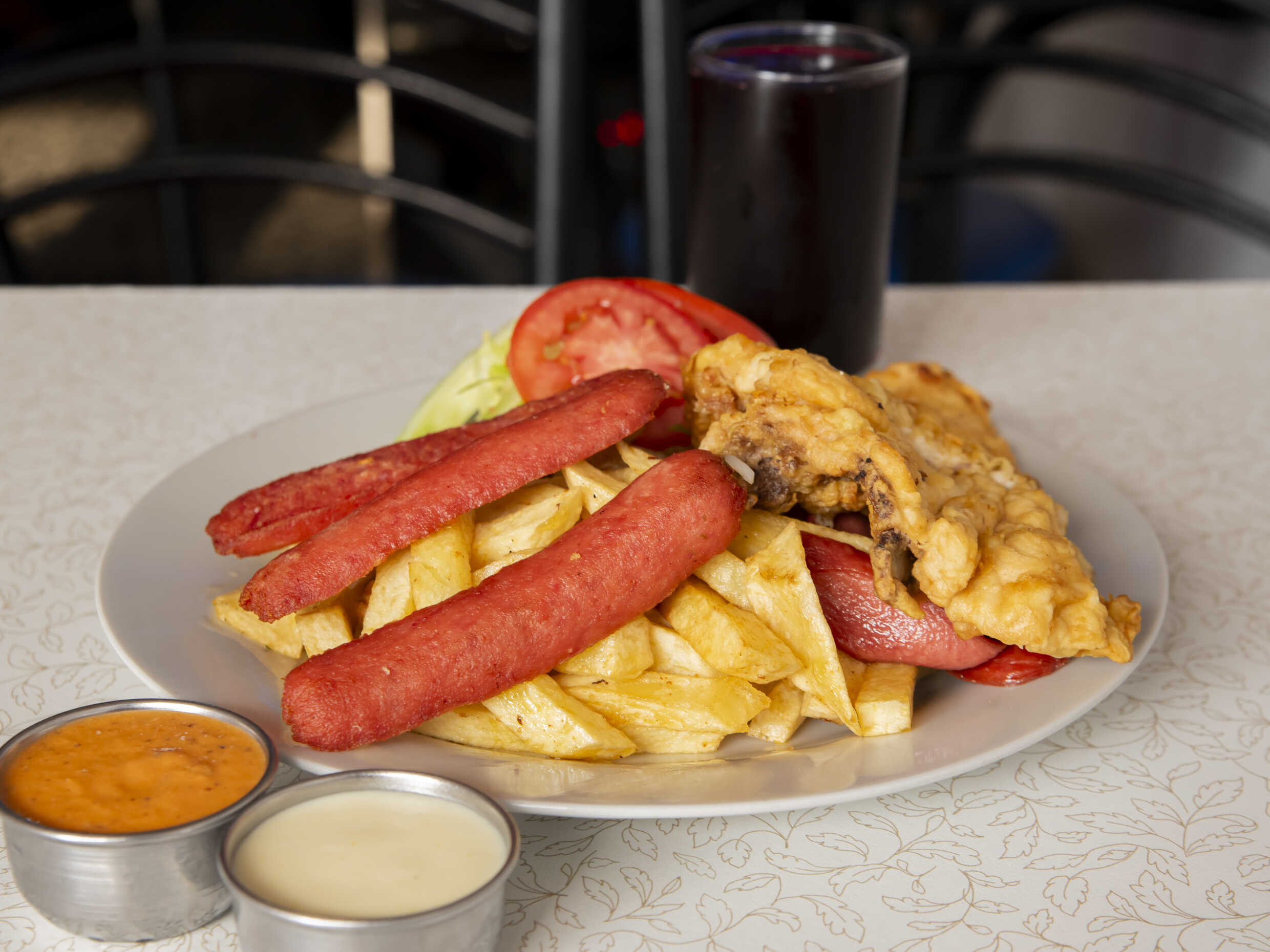 Chorizo, pollo empanizado, papas fritas y ensalada.