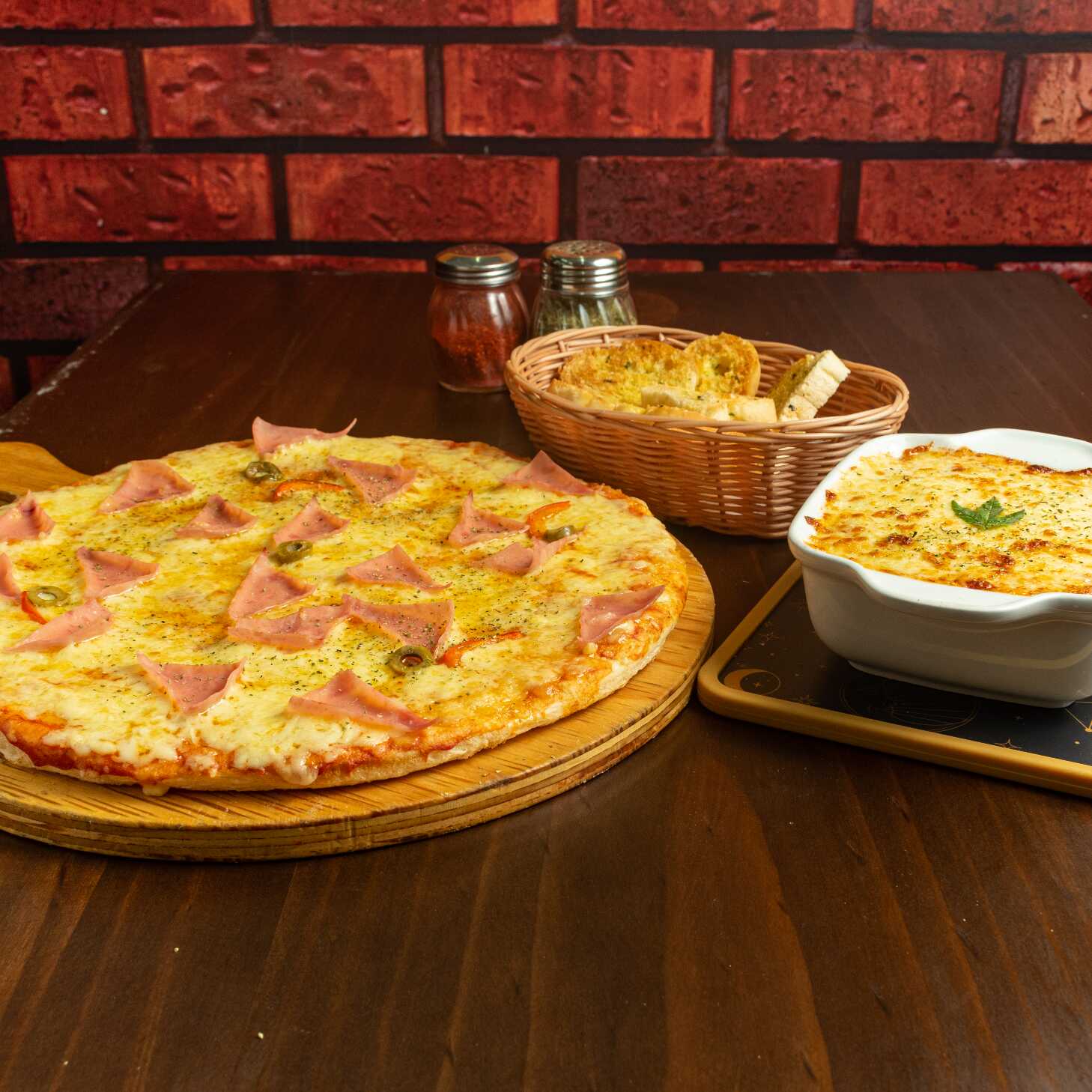 1 Pizza americana, 1 lasagna y pan al ajo.