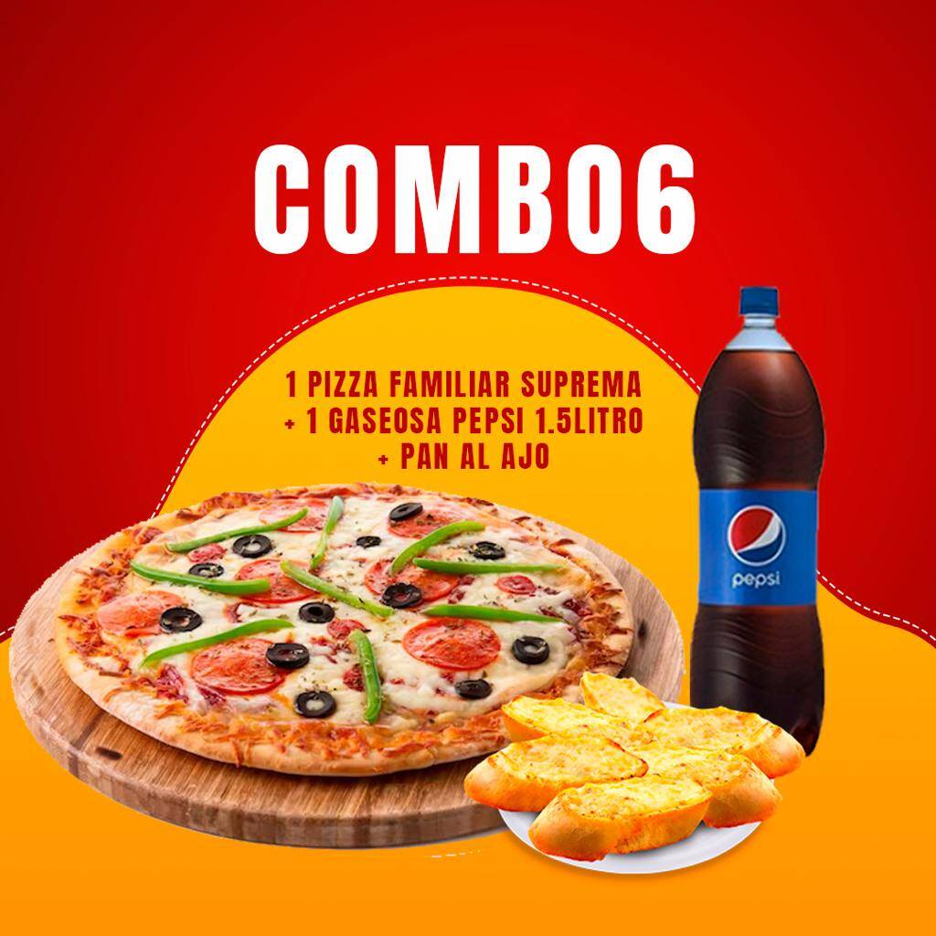 1 Pizza familiar suprema, pan al ajo, gaseosa Pepsi 1.5L.