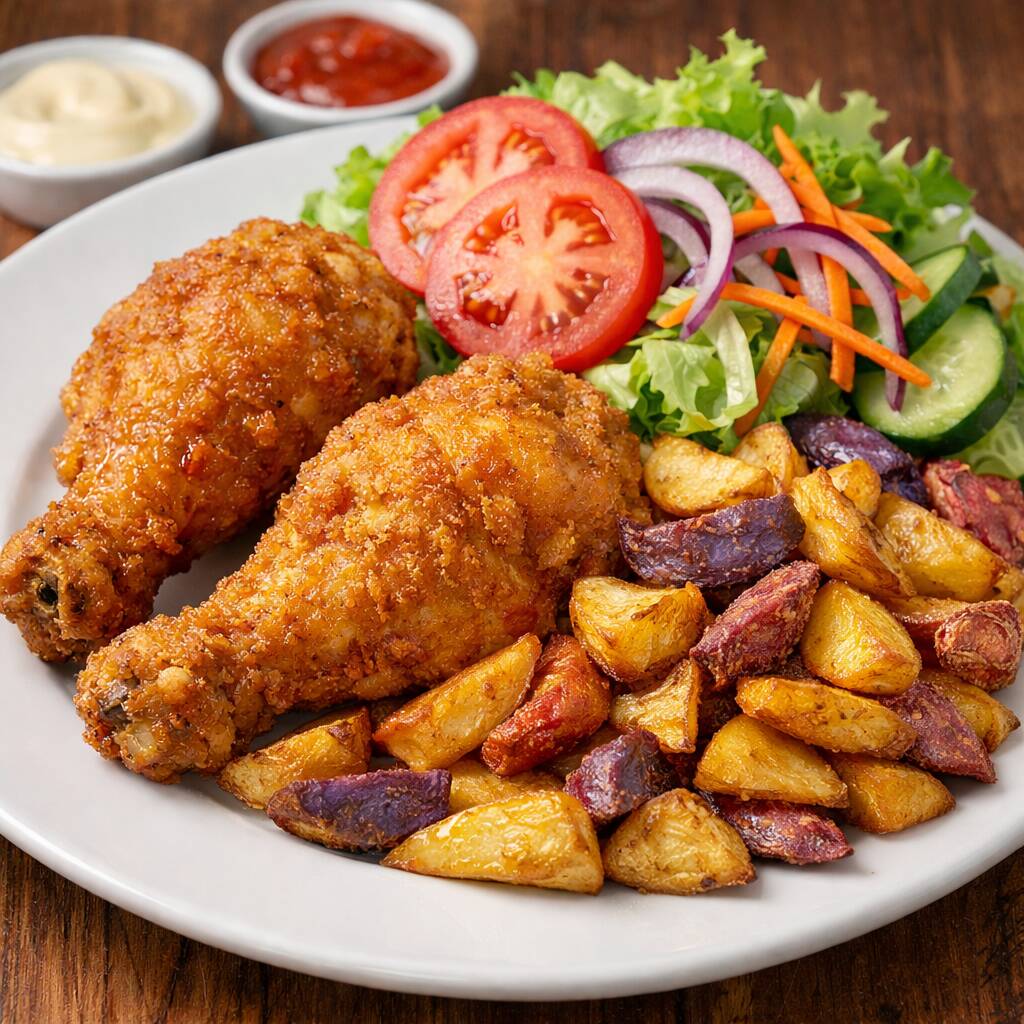 Pechuga broaster con papas peruanitas crocantes y ensalada