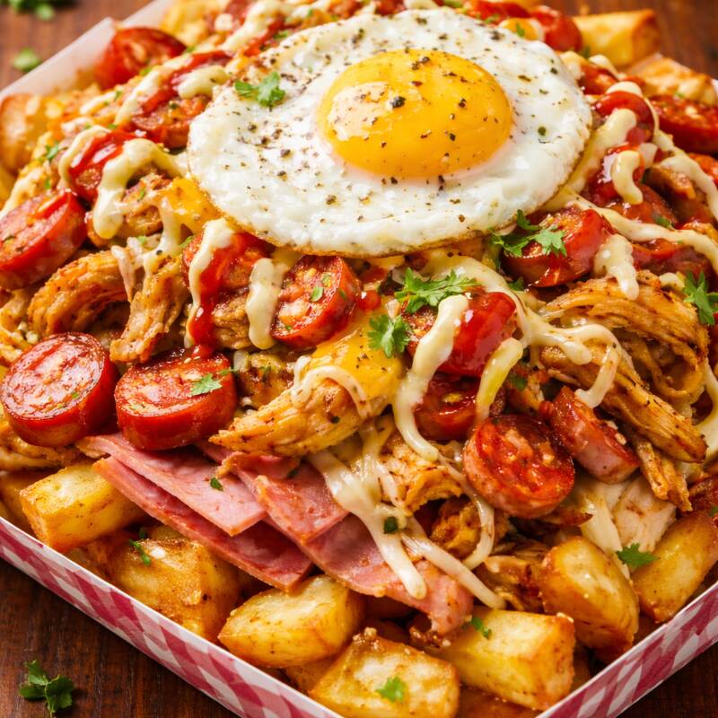 Salchipapa clásica acompañada de jamón, queso dambo, huevo y pollo deshilachado