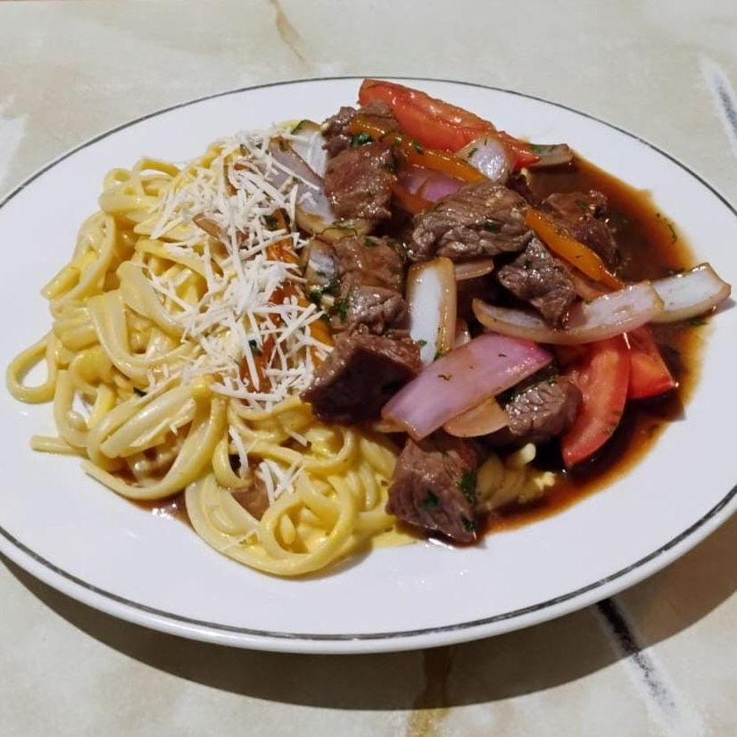 Lingüini a la huancaina con delicioso lomo saltado
