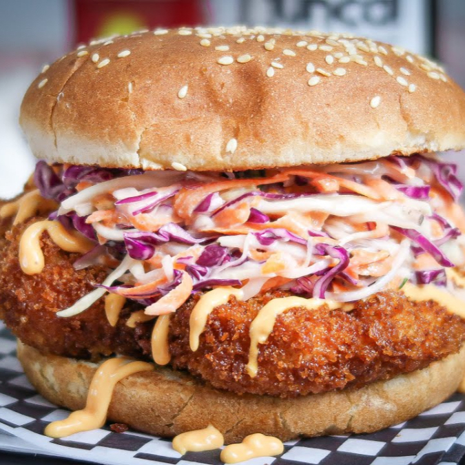 Hamburguesa de pechuga de pollo crispy acompañada de colslaw, ensalada y queso dambo dentro de pan brioche.Con porción de papas nativas