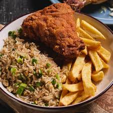 Jugoso encuentro broaster con arroz chaufa y papas fritas