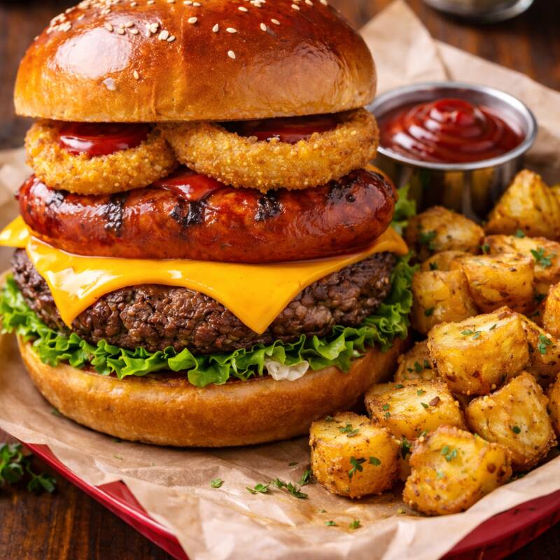 Hamburguesa artesanal con cheddar, chorizo parrillero, aros de cebolla, ensalada y papa peruanita crocante