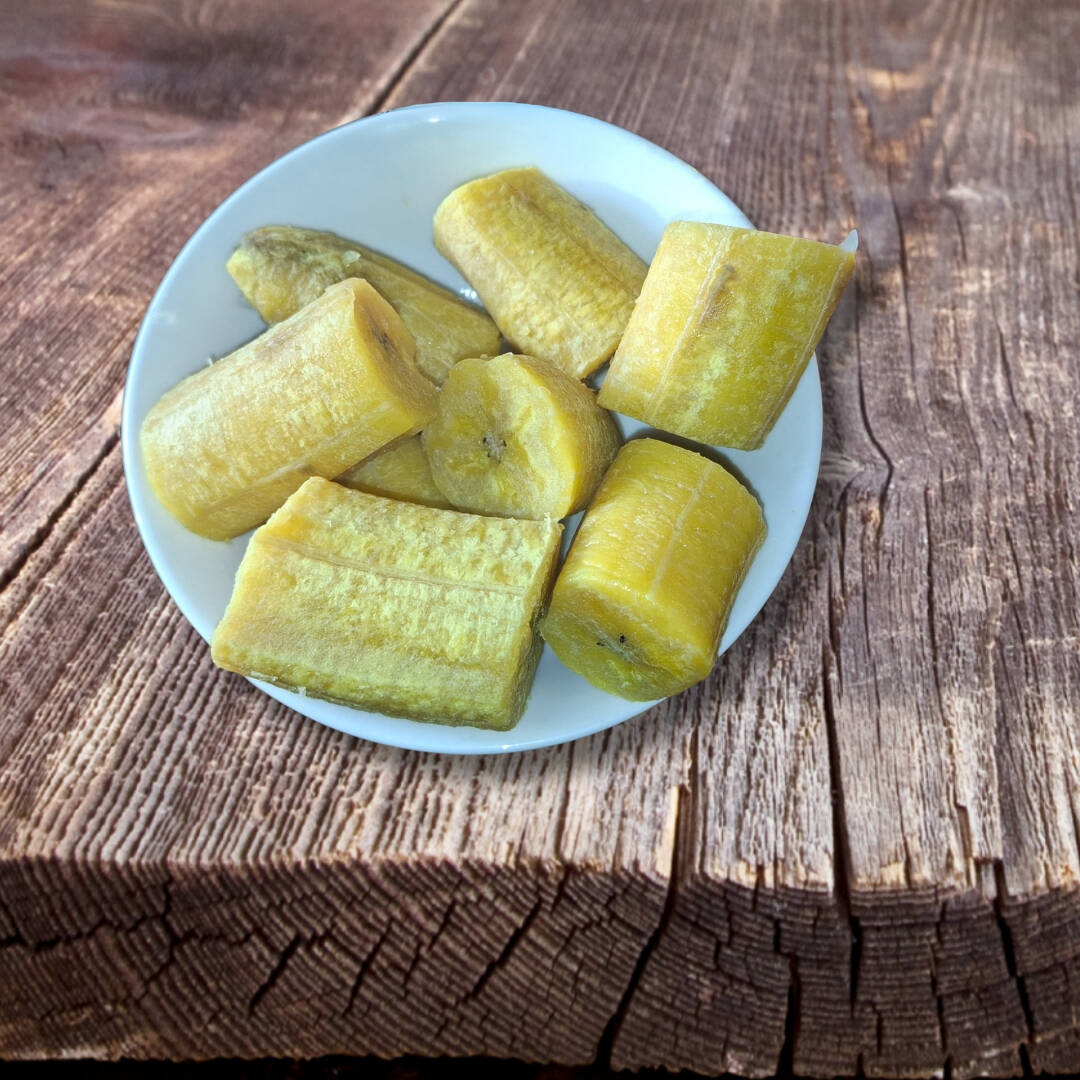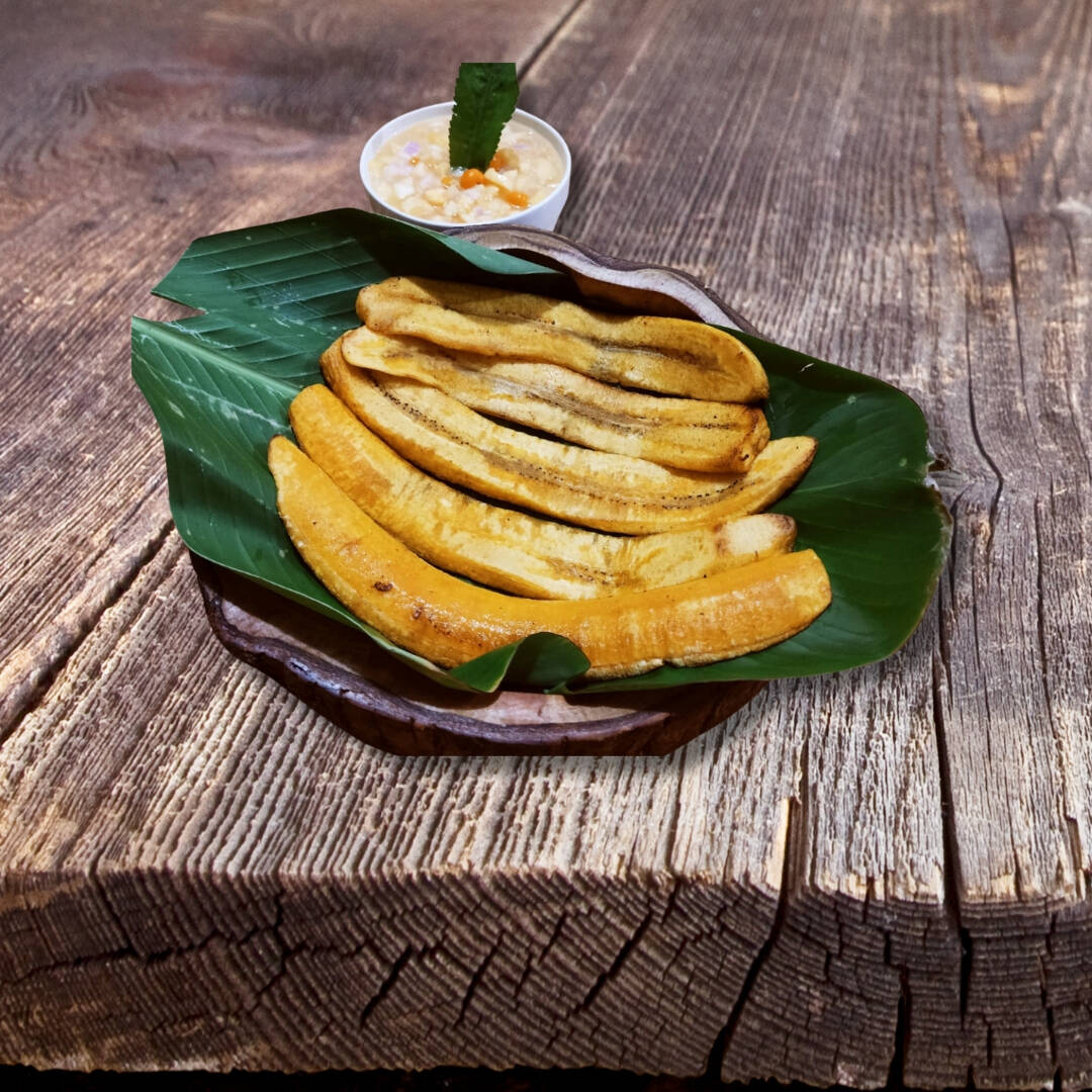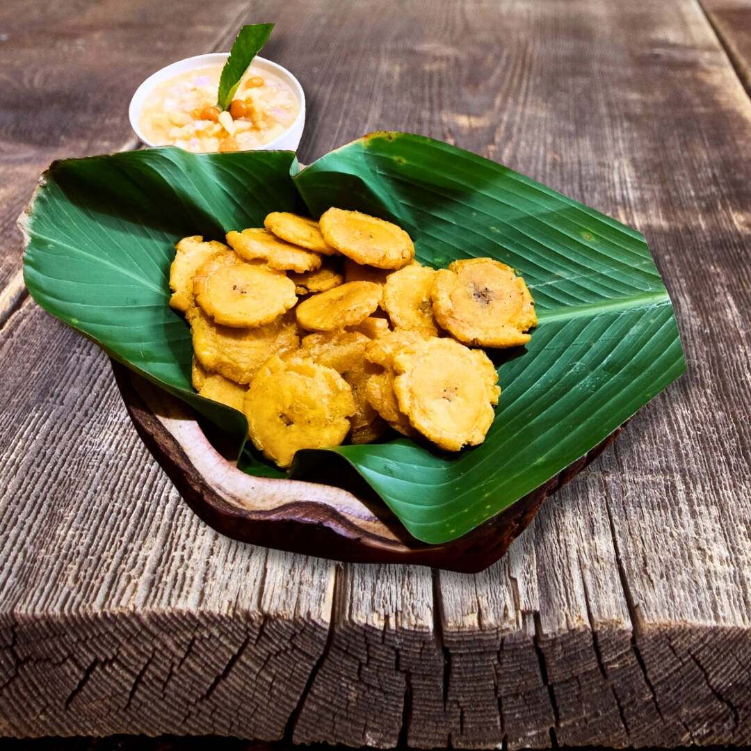 Cecina y chorizo en trozos arrebozado con huevo y harina frito, acompañado con plátano verde frito y ají de cocona.