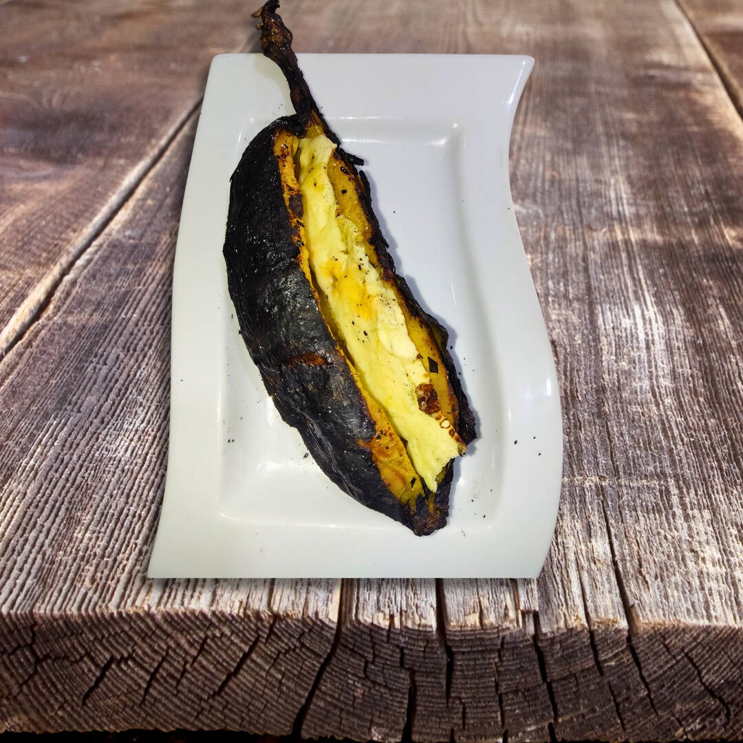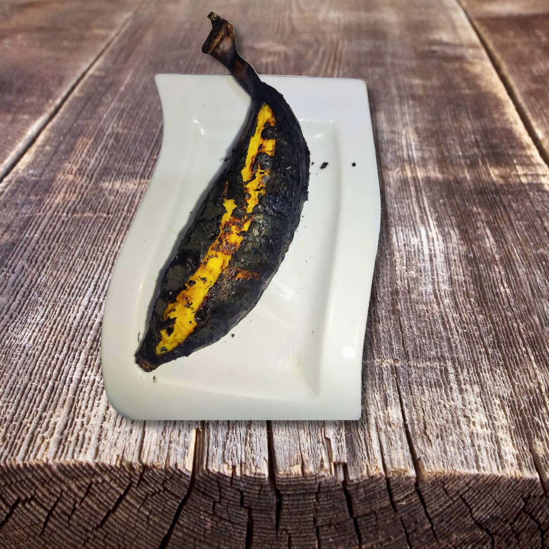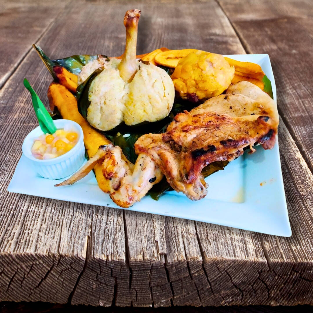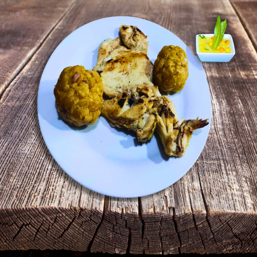 Pollo cocido al carbón, 2 bolas de tacacho, ají de cocona.
