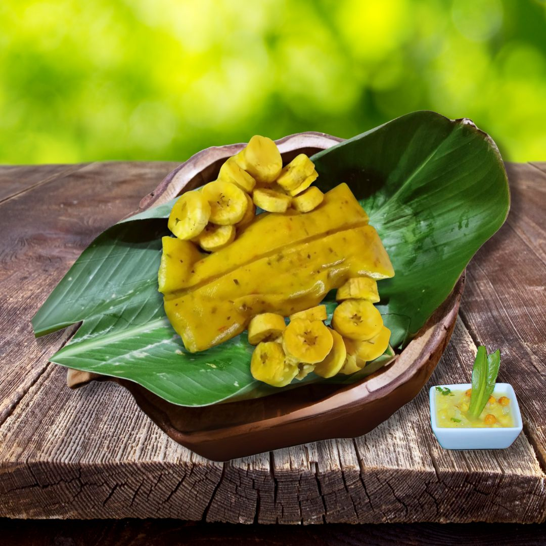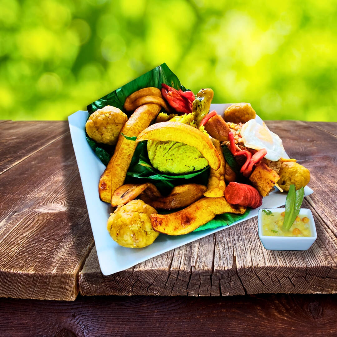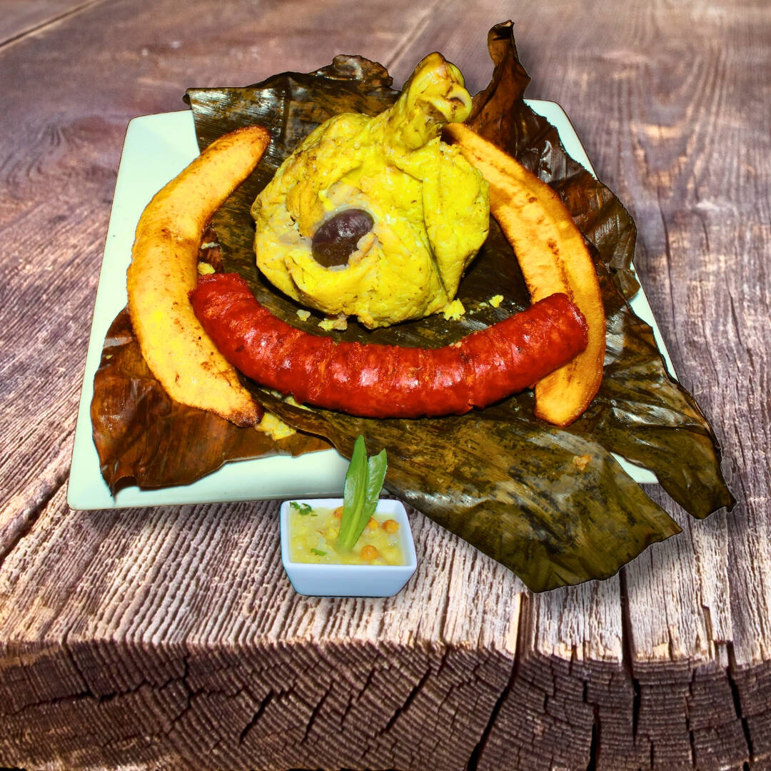1 Juane de pollo, 1 porción de cecina, 1 porción de chorizo, 2 bolas de tacacho, maduro frito, ají de cocona.
