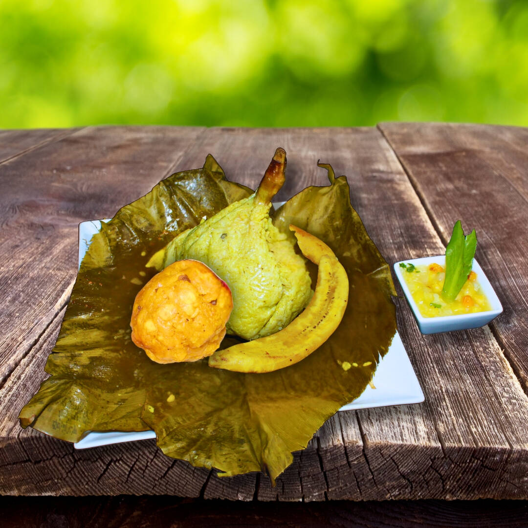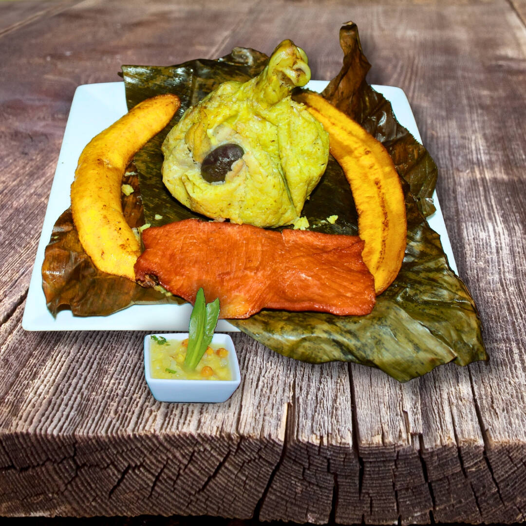 Juane tradicional de gallina, maduro frito, ají de cocona.
