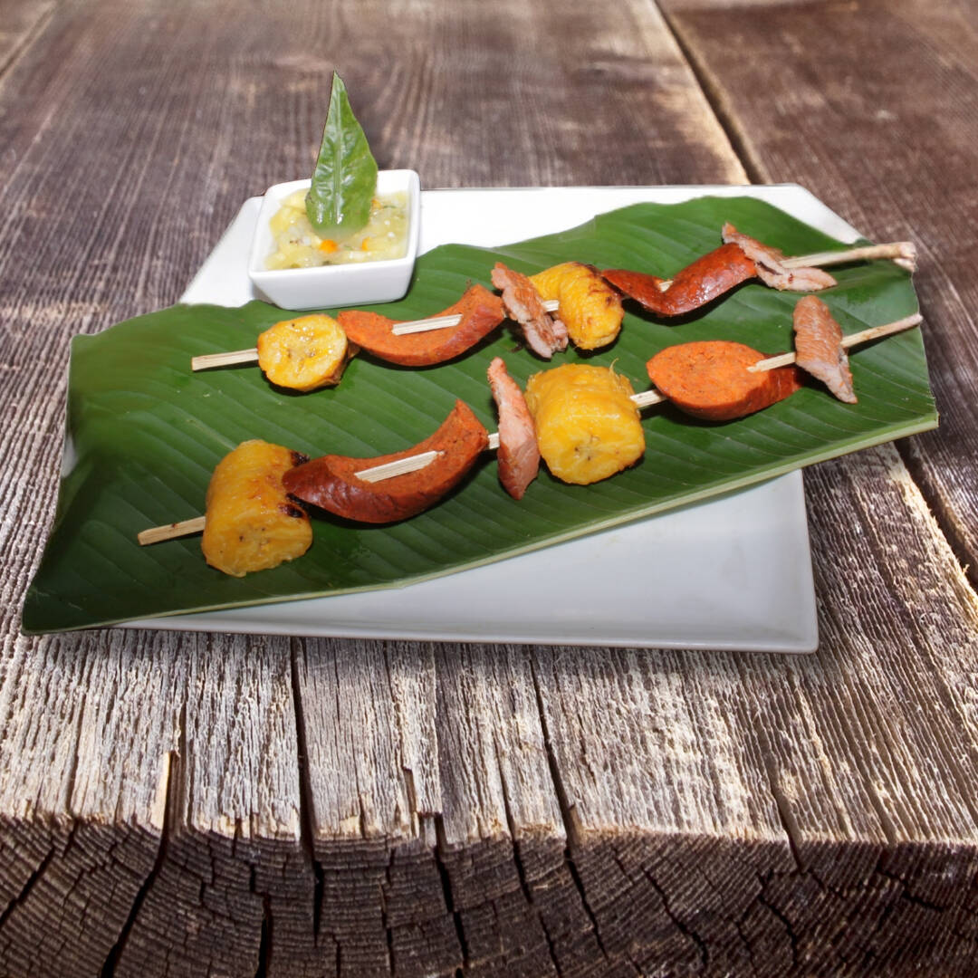 2 Brochetas amazónicas hechas a base de trozos de cecina y chorizo y maduro, ají de cocona.