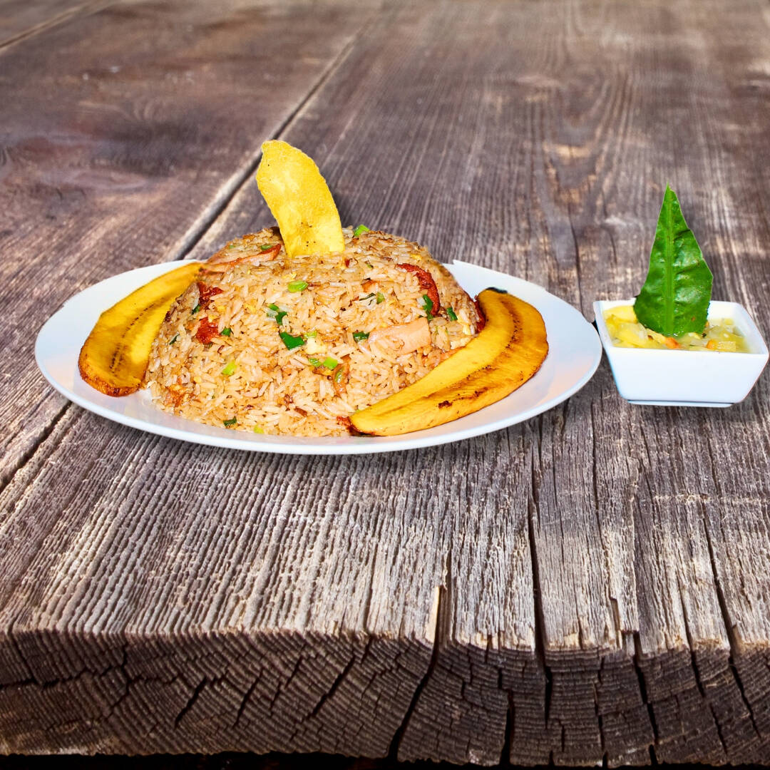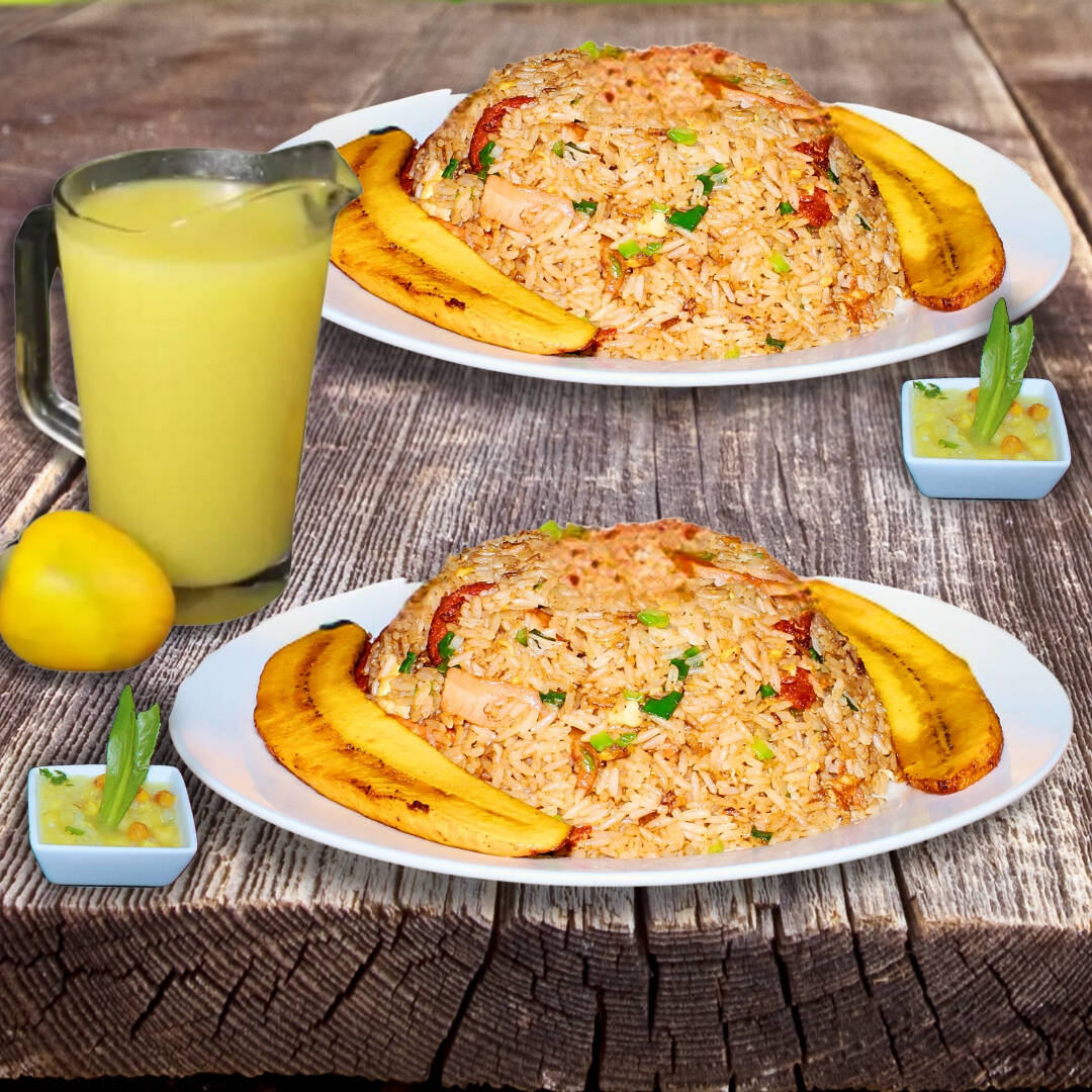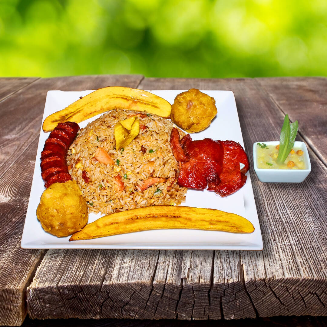 Chaufa amazónico, 1 porción de cecina, 1 porción de chorizo, bolas de tacacho, maduro frito, ají de cocona.