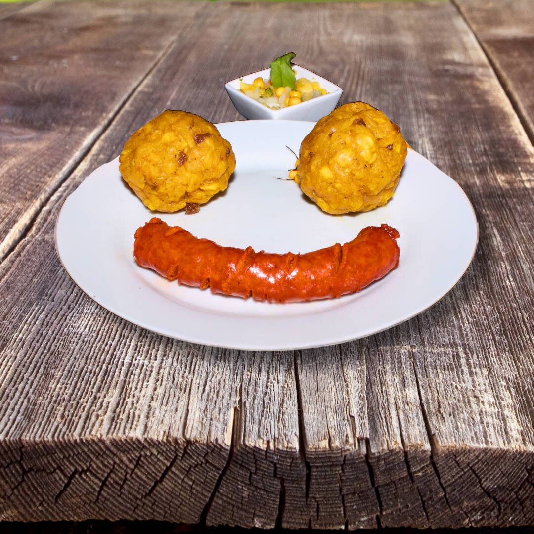 2 Bolas de tacacho, 1 porción de chorizo, ají de cocona.