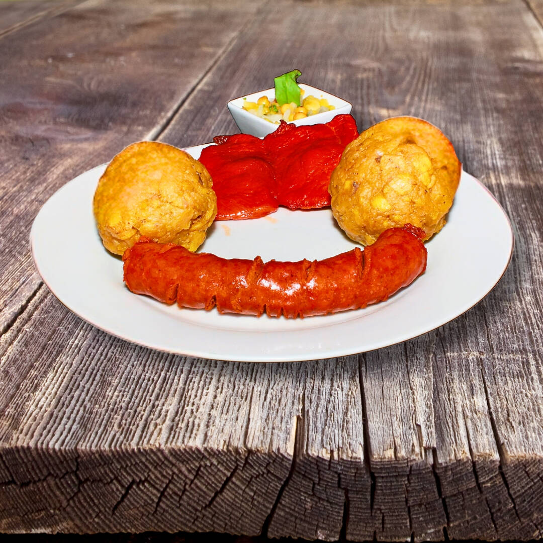 2 bolas de tacacho, 1 porción de chorizo, 1 porción de cecina, ají de cocona.