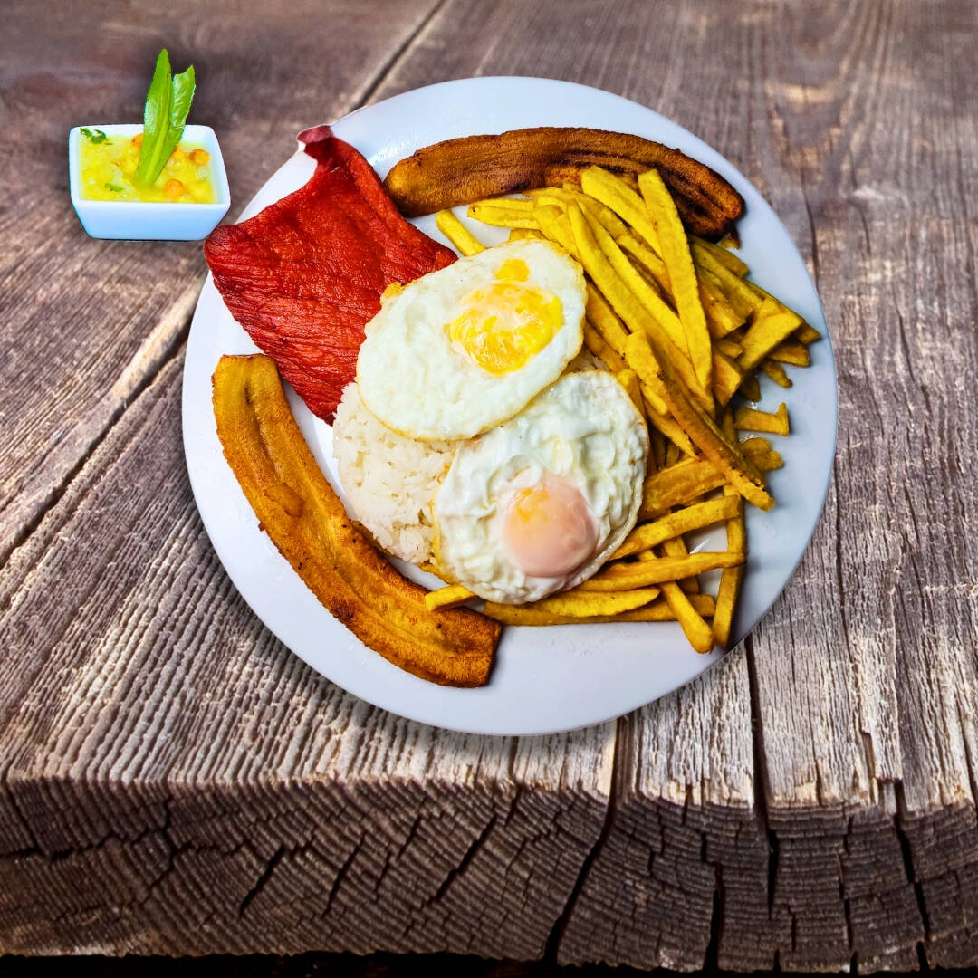 Bisteck de cecina, maduro frito, huevo frito, arroz blanco, plátano verde frito al estilo papa frita, ají de cocona.