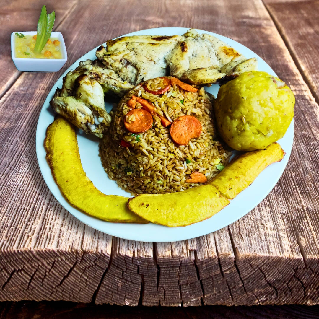 1/4 Pollo canga, chaufa amazónico, tacacho, 01 porción de maduro frito, ají de cocona.