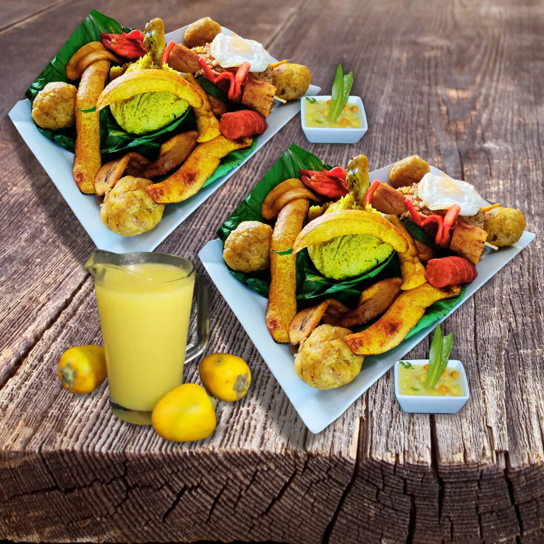 Juane de pollo, chaufa amazónico, porción cecina, porción chorizo, brocheta amazónica, huevo frito, maduro frito y ají de cocona.