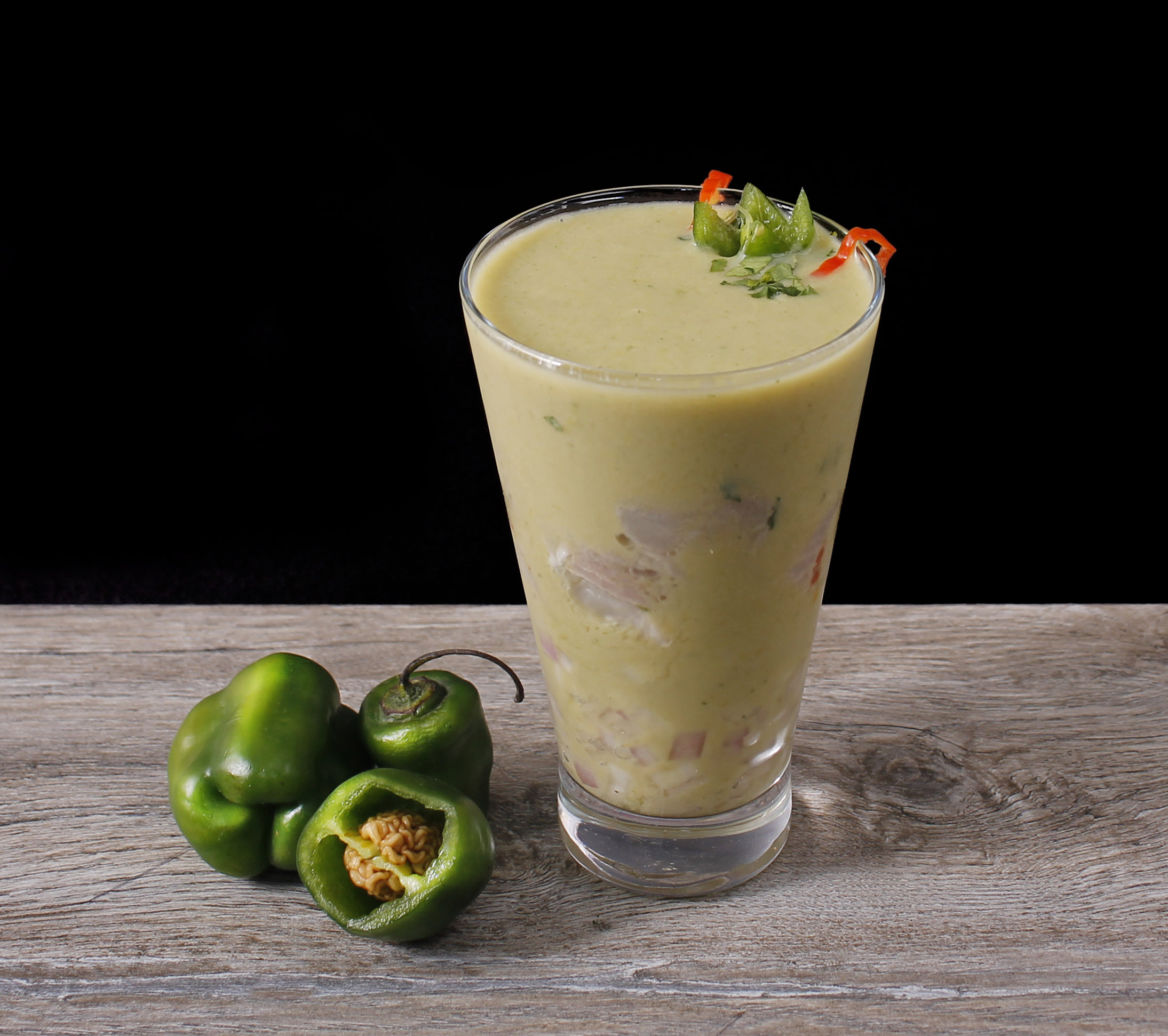 A base de pimiento verde, cebolla blanca y ají limo rojo.