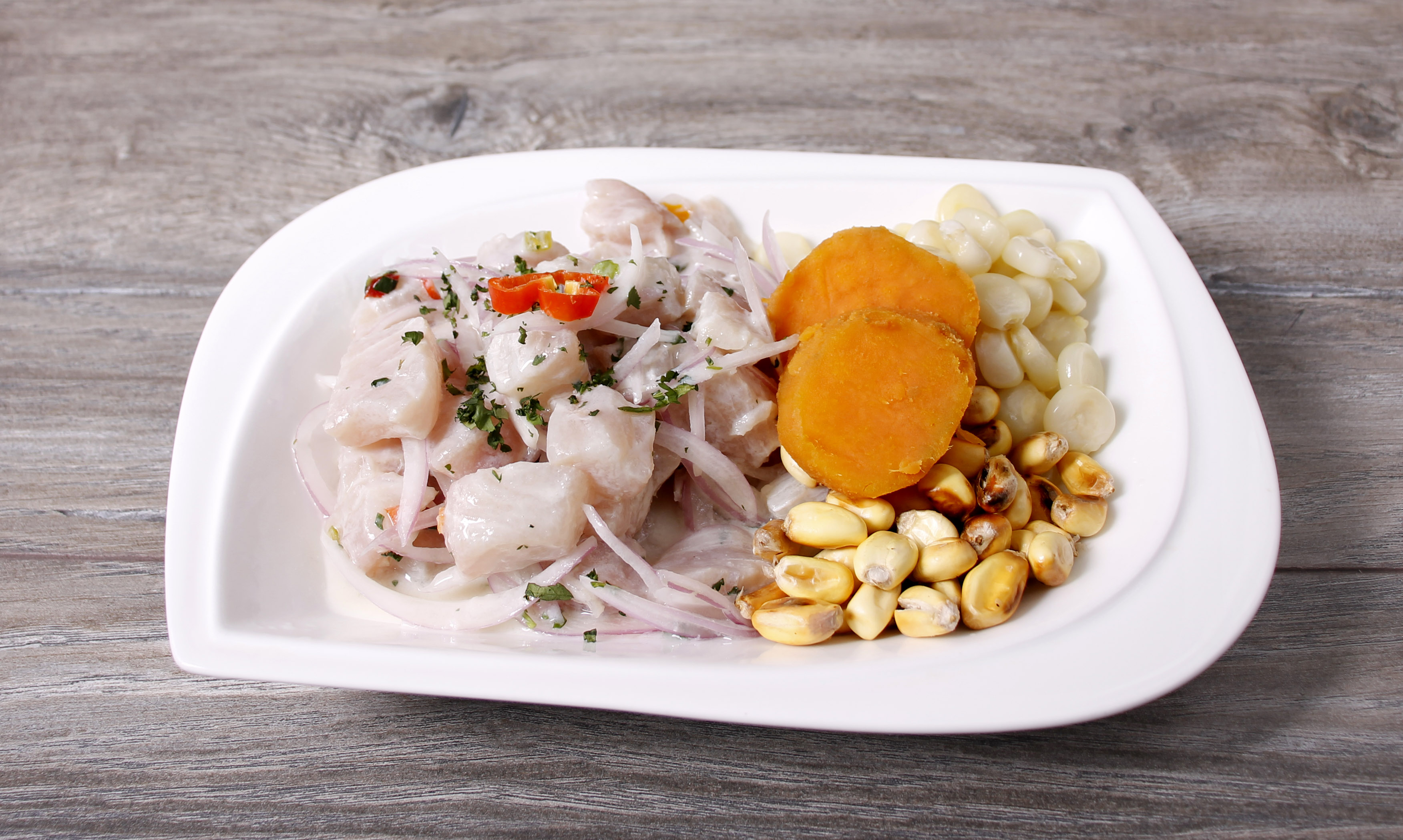 Ceviche tradicional servido con un toque especial como plato de fondo.