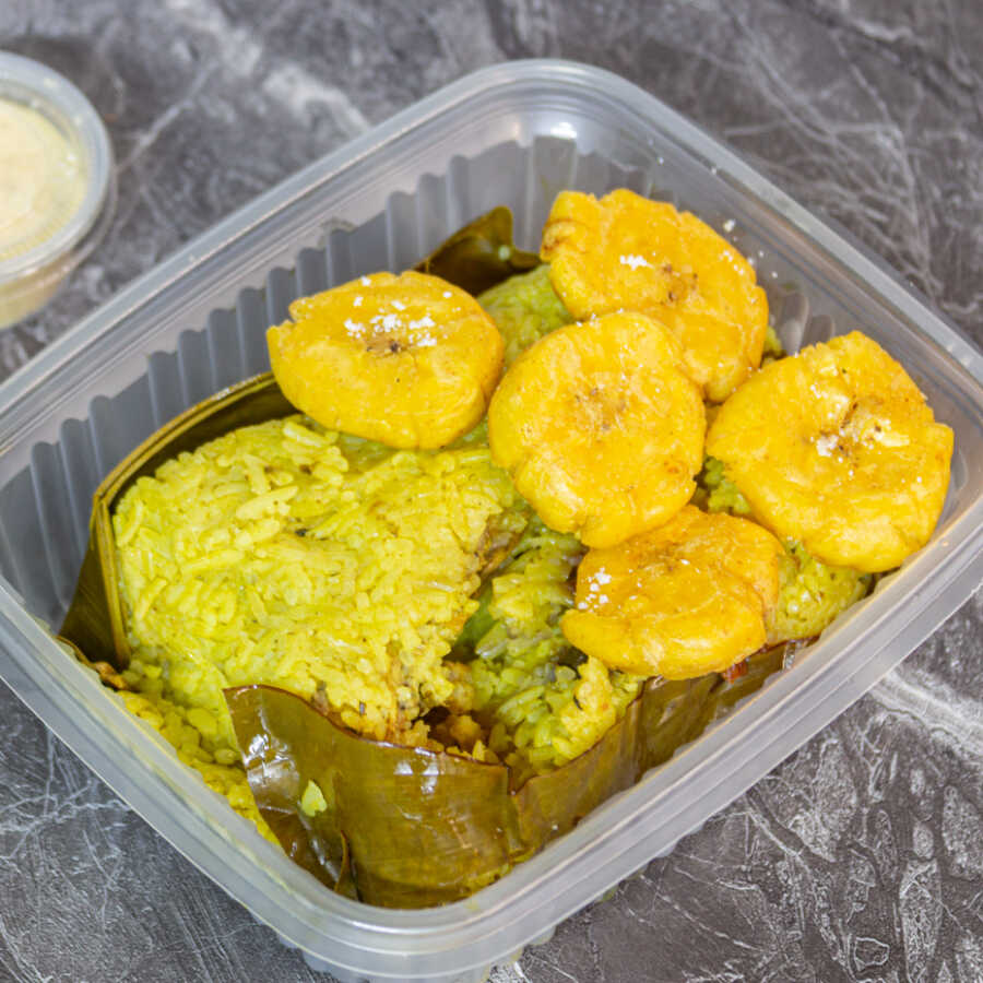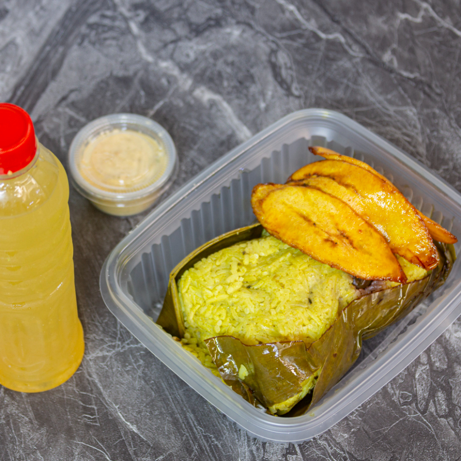 Arroz envuelto en hoja de bijao, huevo, aceituna, presa de pollo y patacones.