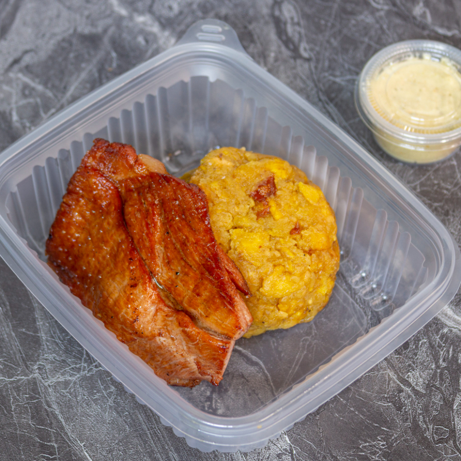 Cecina ahumada con 1 bola de tacacho, ensalada y ají de cocona con charapita. porcion personal