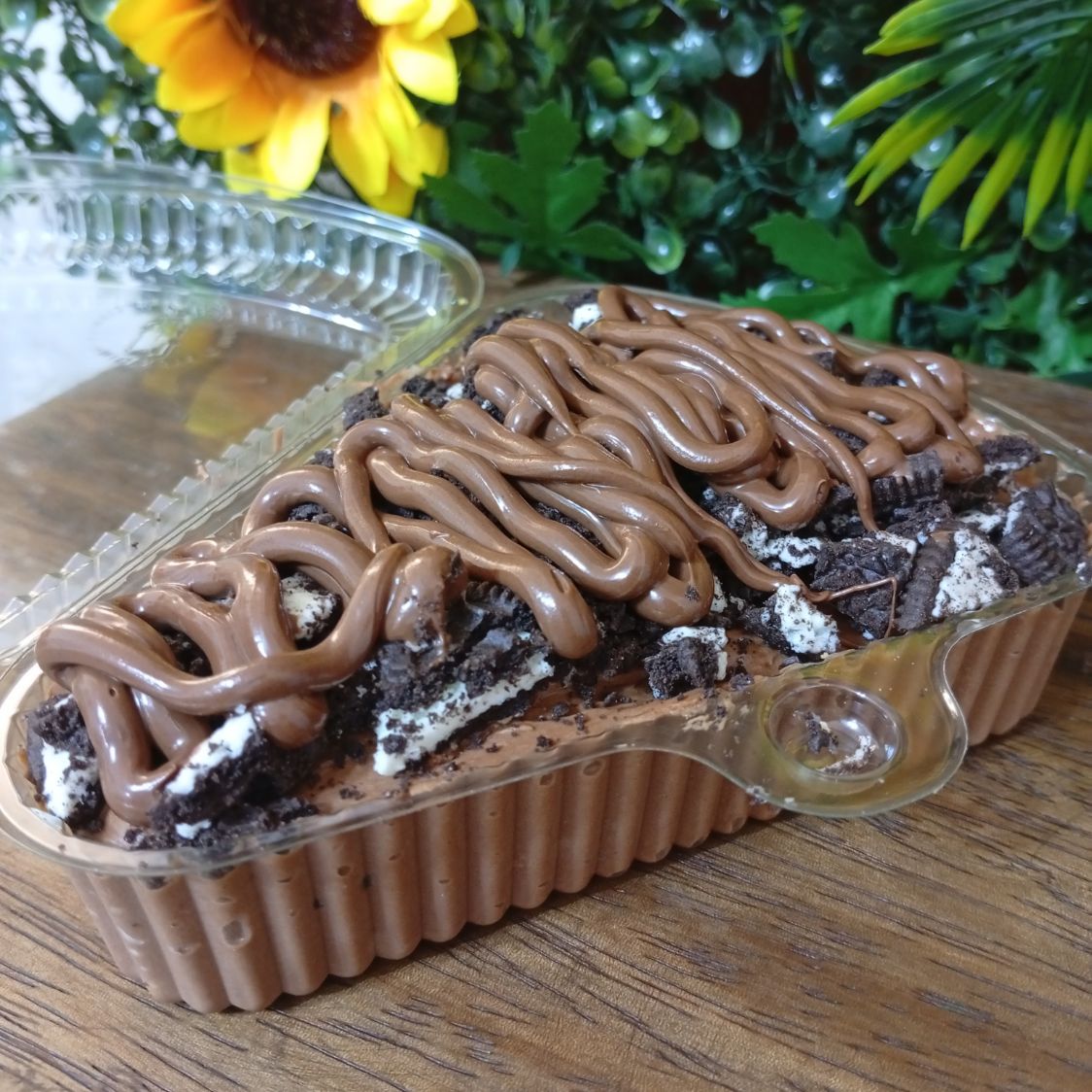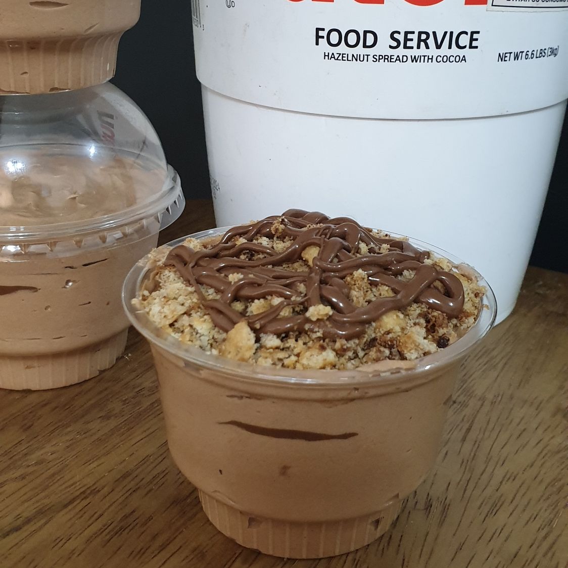 Capas de galletas vainilla, crema de nutella, toppins galleta chips ahoy y sirop de nutella. Peso aprox 200gr