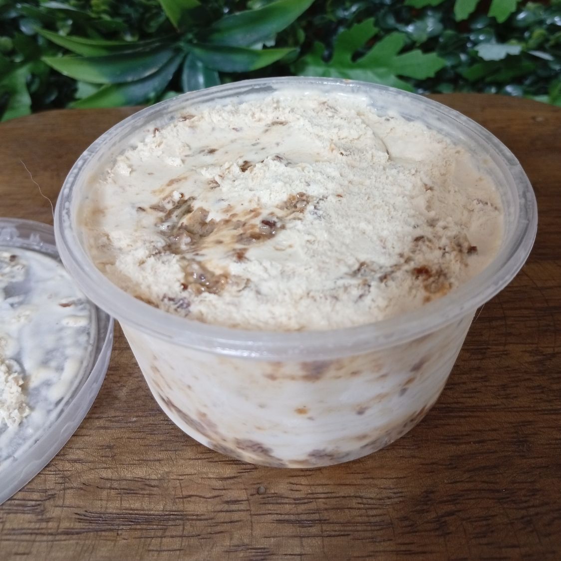 Helado de crema con pasas maceradas en ron. Contiene alcohol