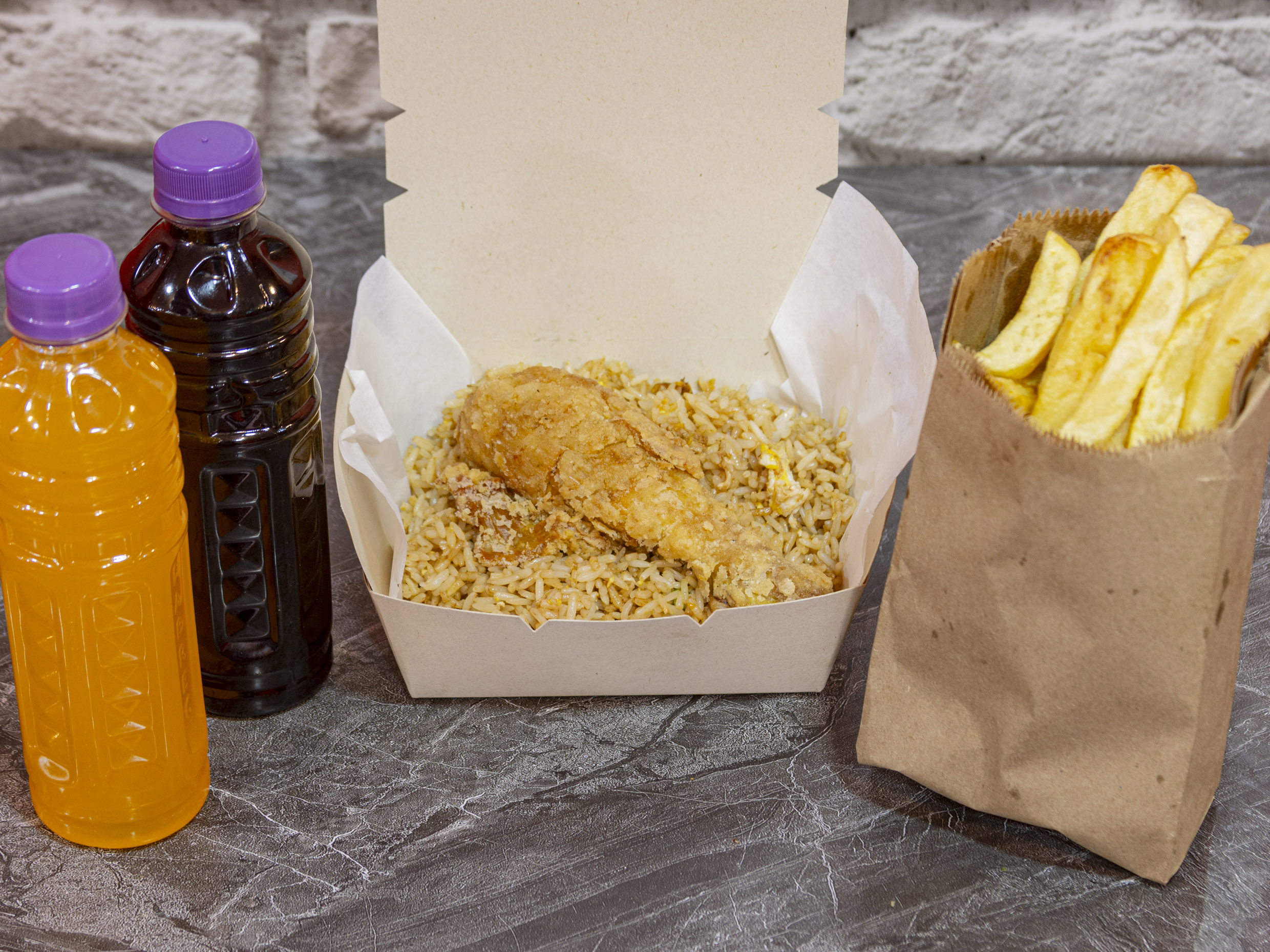 1 Pieza De broaster (a disponibilidad) más chaufa (200 g), papas fritas (200 g), mostaza, mayonesa, kétchup y ají picante.