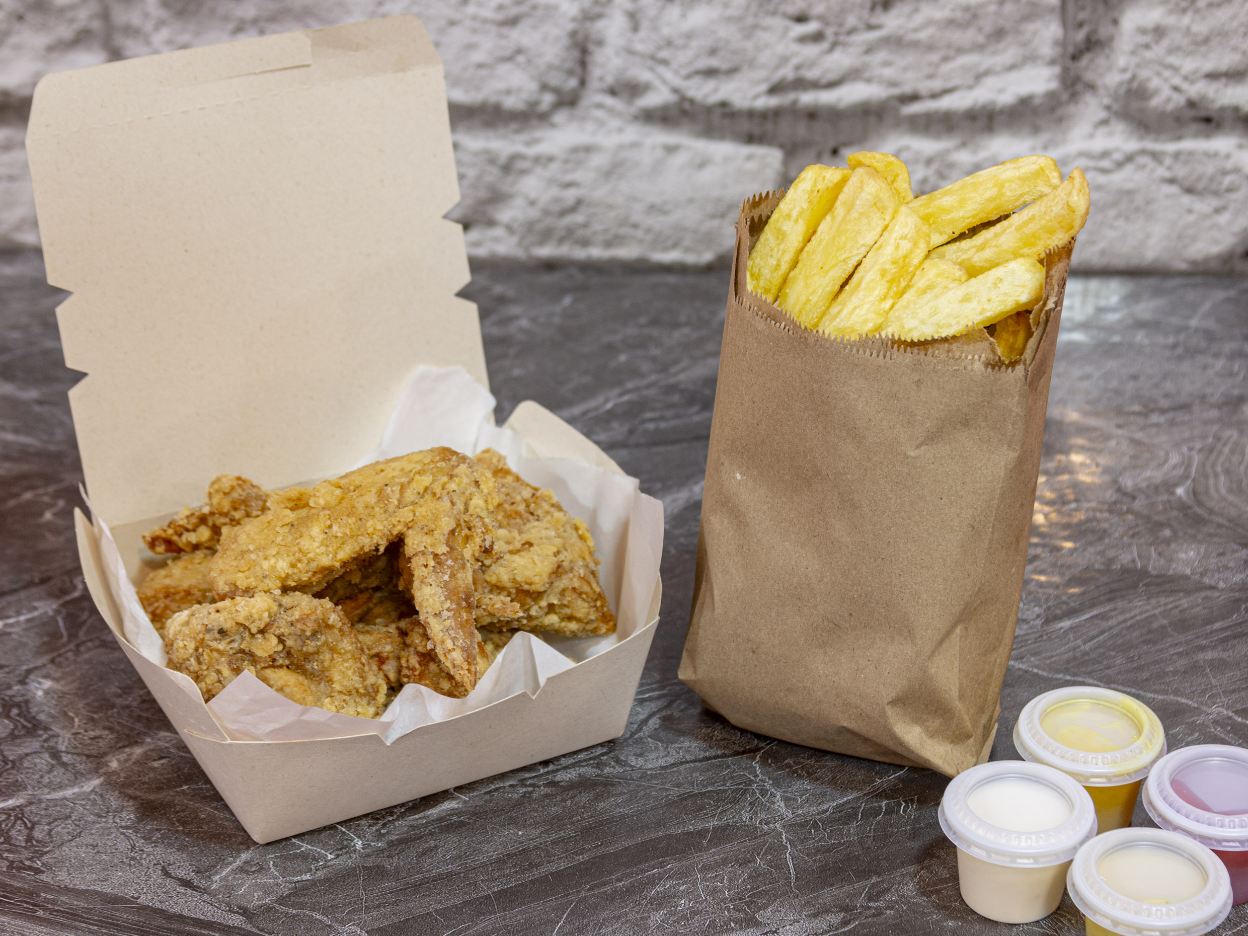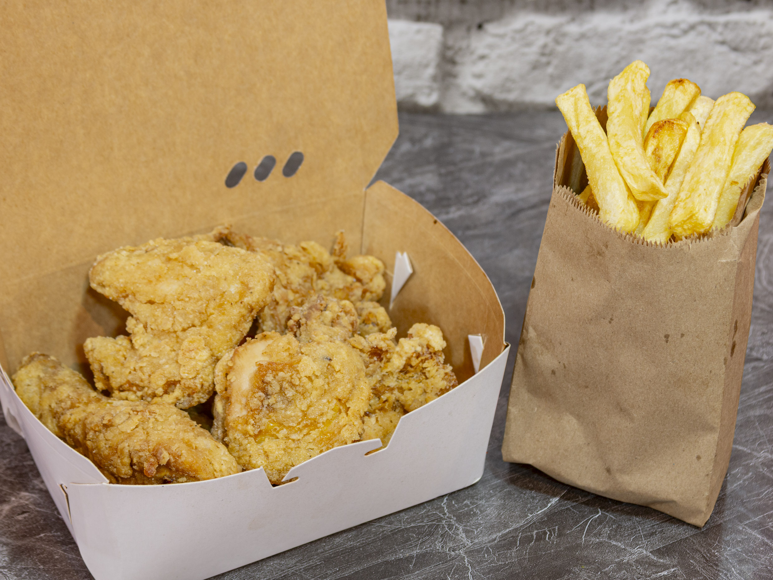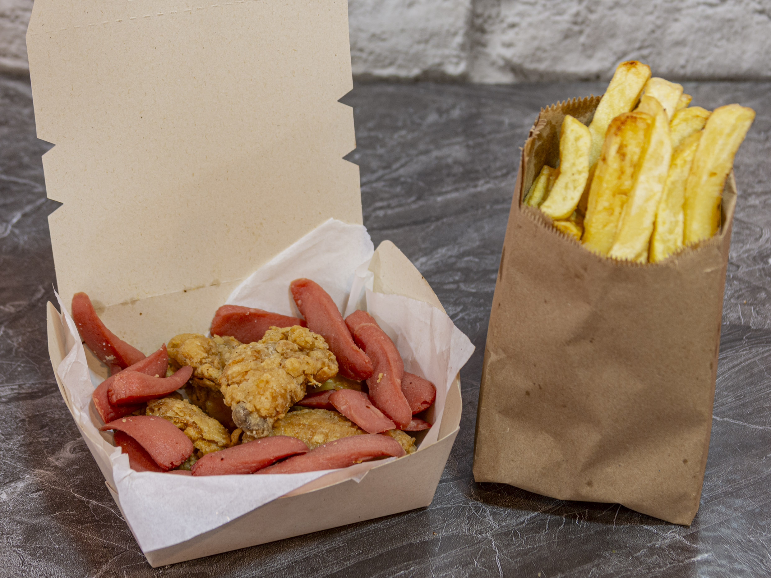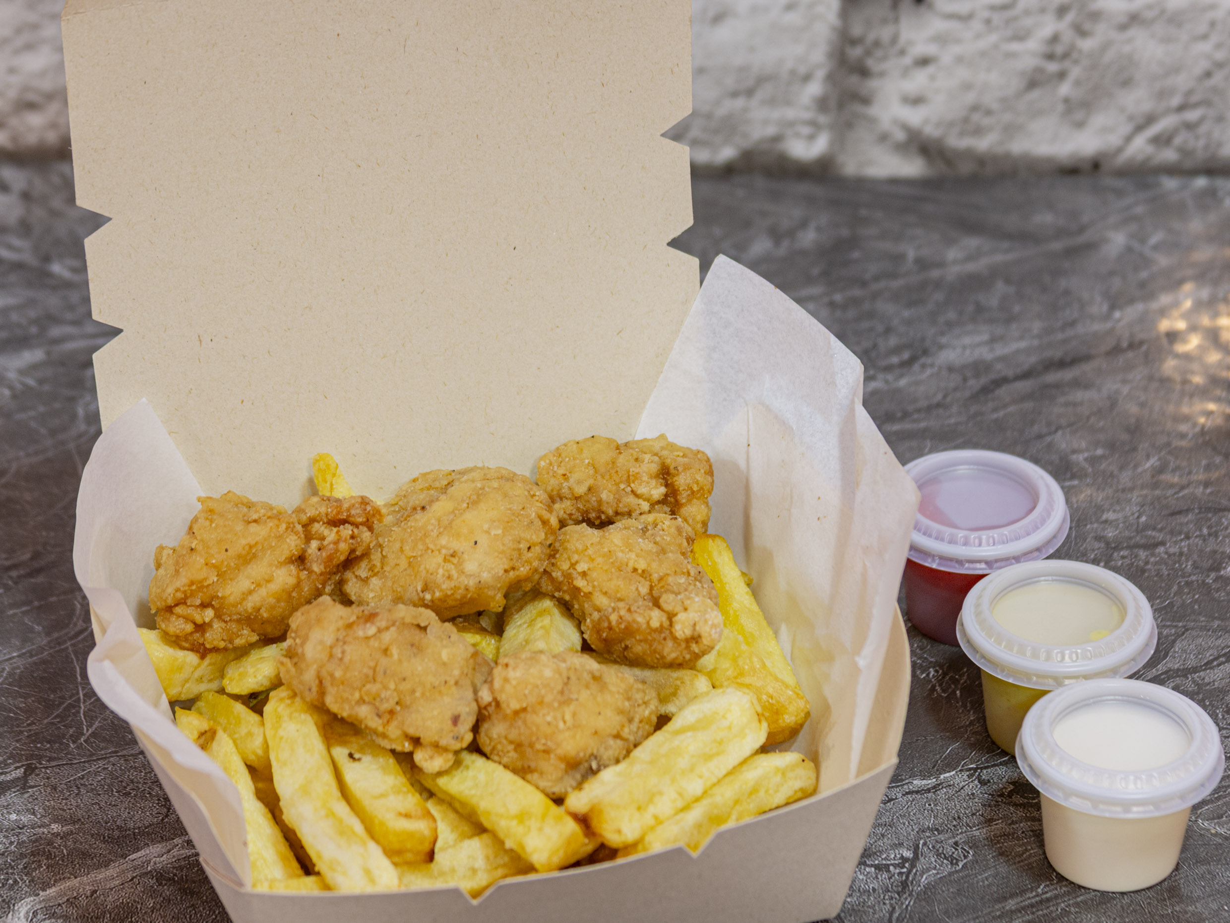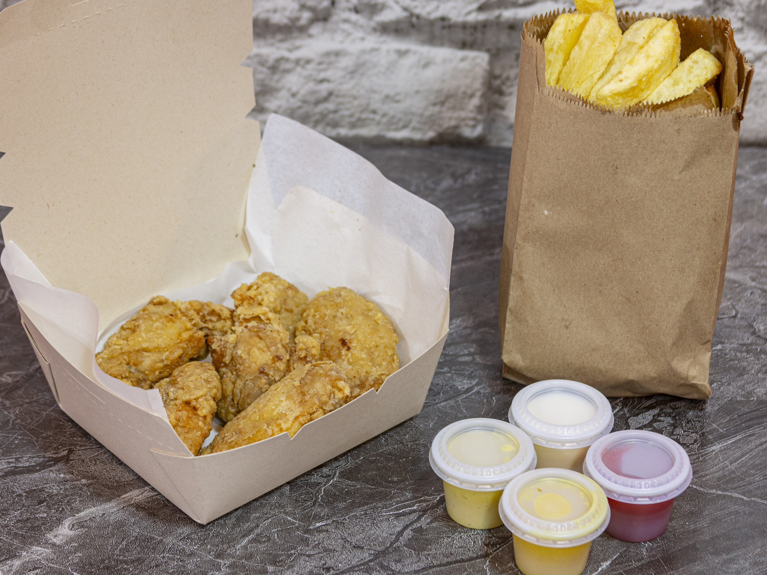 3 piezas más 4 nuggets, acompañados de 2 porciones de papas fritas y crema..
