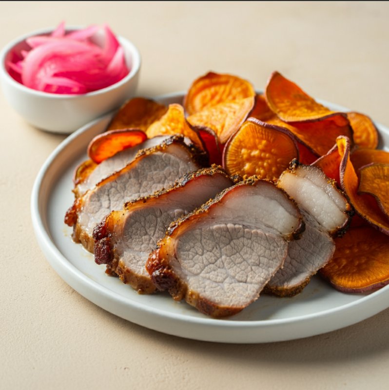 Cuarto de kilo de chicharrón de cerdo con chips de camote, zarza criolla y salsa a elección.