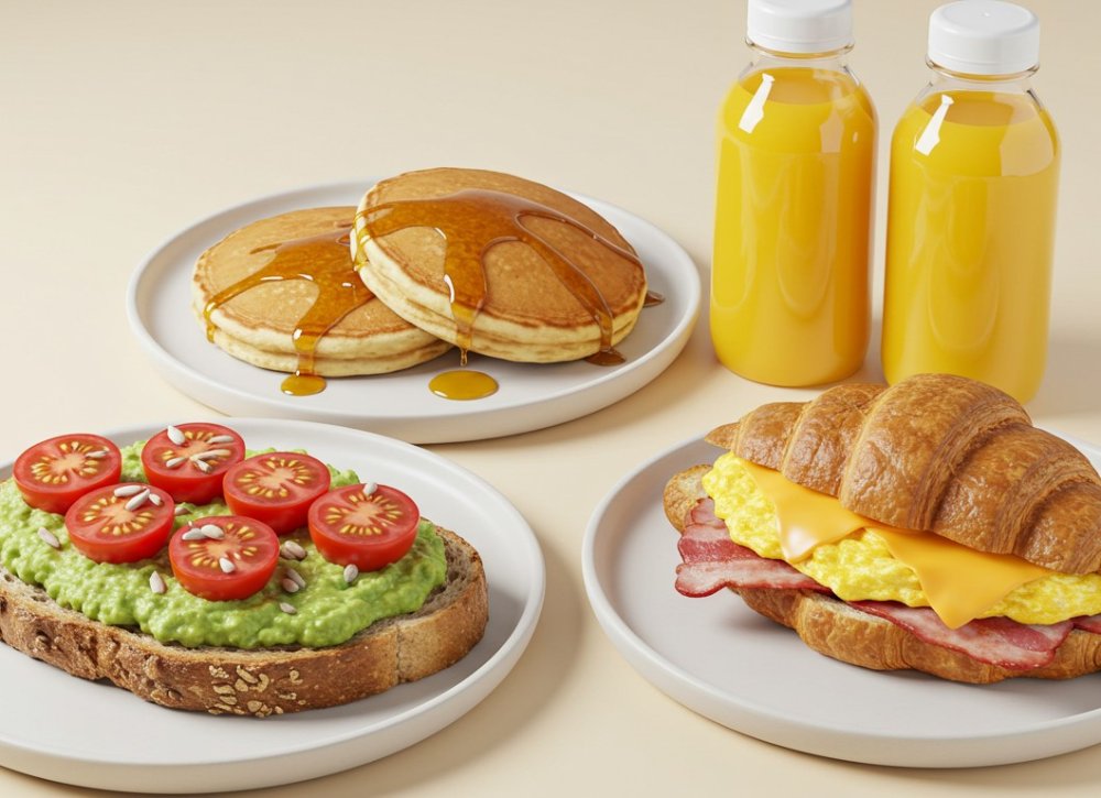 Incluye una tostada de palta, un croissant de huevo, tocino y queso, unos pancakes tradicionales para compartir y dos bebidas.